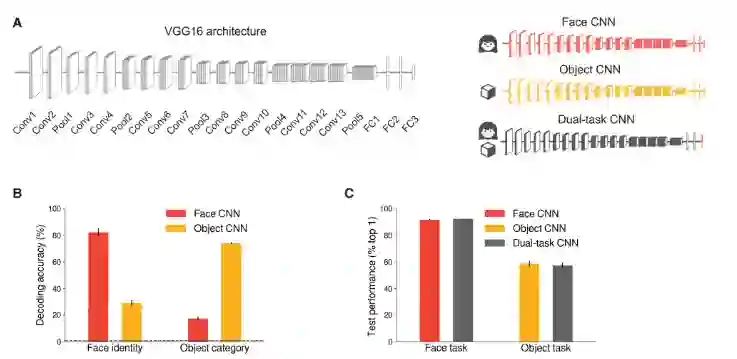 图1:单独训练的 CNN 中的人脸和物体表现不同,而双任务 CNN 表现良好。(A) 优化了三个具有 VGG16 架构的网络(左),一个用于人脸识别分类(红色的人脸 CNN),一个用于物体分类(物体CNN 为橙色),一个同时处理两个任务(双任务 CNN 为灰色)。(B) 使用从 Face CNN 和 Object CNN 的倒数第二层 [即 (A) 中的 FC2] 提取的激活模式,对保留的人脸识别和保留的物体类别进行解码的准确性。Face CNN 在人脸解码方面优于 Object CNN,在物体解码方面反之亦然。因此,为每个任务优化的表示并不自然地支持另一个。灰色虚线表示机会水平 (1%)。误差线表示跨分类折叠的 SEM。(C) 双任务 CNN 对执行的任务和单一网络进行了优化。误差线表示跨类和刺激自举的 95% 置信区间 (CI)。