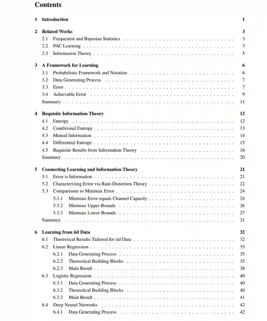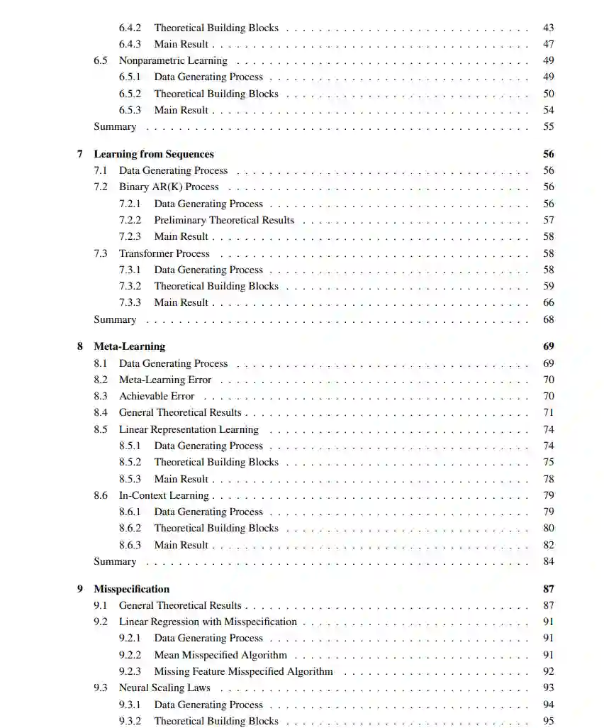 具体而言,我们构建了一个以贝叶斯统计学为基础的信息论框架,足够通用以统一对多种机器学习现象的分析。这些学习情境包括:从经典的可交换数据(exchangeable data)学习,到存在强序列性或层次结构的数据;也包括模型失配(misspecification)的情境,即学习模型本身与真实数据分布存在结构性不一致的问题——这在面对日益复杂的学习任务时尤为重要。 我们的框架深受香农信息论思想的启发,特别是他提出的核心原则:“先信息,后计算(information first, then computation)”。20 世纪初期,通信领域兴起,对远距离信号传输的研究推动了编码与解码技术的发展,当时许多工作也依赖经验与启发式方法,正如今日深度学习的实践。香农的信息论则回归根本,明确了在不考虑计算资源的前提下,哪些事情是可能的、哪些是不可能的。这一理论不仅指导了极限算法的设计,也推动了后续的工程实践。 当前机器学习与人工智能领域的快速发展让人充满信心,仿佛“只要有足够数据与计算力,一切皆可学习”。但现实是,大多数研究方向仍主要受非正式推理与大量实验数据的驱动,而统计学虽提供部分指导,但难以解释层出不穷的新现象。本专著试图填补这一空白:构建一个通用框架,研究机器学习性能的根本限制是如何由数据的信息量所决定的。 我们从刻画“最优贝叶斯学习器(optimal Bayesian learner)”在面对不同复杂度数据生成过程时的性能表现入手。通过不考虑计算约束,来分析哪些学习任务是信息论上可实现的,从而建立起能指导实证探索的直觉理解。 与许多在数据复杂性提升时性能下降的现有理论不同,我们的信息论工具在多种机器学习情境下仍能提供准确的洞察。例如,现有关于序列数据学习的理论常依赖特定的混合时间假设,而我们借助 Jeon 等人【2024】的成果,利用信息论工具,刻画了由 Transformer【Vaswani et al., 2017】自回归生成的序列数据的样本复杂度。我们还扩展该框架至层次结构数据生成过程,以分析类似于元学习与大语言模型“上下文学习(in-context learning)”的现象。 这些结果在交换数据与复杂结构数据中都适用,体现了理论的基础性与通用性。 近年来,大规模模型训练数据越多、规模越大,其性能持续提升。这说明现实中的数据生成过程远比我们建模时所采用的模型要复杂。这种“模型失配(misspecification)”现象在自然语言处理(NLP)中尤为常见。Kaplan 等人【2020】与 Hoffmann 等人【2022】通过经验研究提出了“神经缩放定律(neural scaling laws)”,揭示了模型性能(如对测试集的 log-loss)如何随着计算资源与数据规模线性改善。 然而,这些缩放定律虽有丰富实证支持,却缺乏扎实的理论分析,尤其是在面对不同数据复杂性时规律如何变化的问题上仍存疑。Jeon 与 Roy【2024】利用本专著提出的理论工具,首次从信息论角度严谨刻画了失配算法的误差。我们在此基础上进一步扩展,分析了更自然的失配学习器:一个基于错误先验分布进行贝叶斯推断的算法。我们还研究了一个由无限宽单隐层网络生成数据的过程,并理论推导出在有限计算预算下应如何在参数规模与数据量之间进行最优分配。这一结果与 Hoffmann 等人【2022】提出的经验结论——“最优的数据集大小与参数数量呈线性关系”——在对数因子精度上高度一致。 尽管我们的理论未显式考虑计算约束,但近期神经网络相关实证研究【Zhu et al., 2022】表明,常用的随机梯度方法在实践中足以逼近我们理论中揭示的“信息与性能”之间的最优权衡。 在本书中,我们不仅推导了理论结果,还通过多类具体场景验证其广泛适用性,包括: * 从未知分布中独立同分布采样的数据; * 顺序数据; * 具备层次结构、适用于元学习的数据; * 模型失配下的次优算法性能分析。
