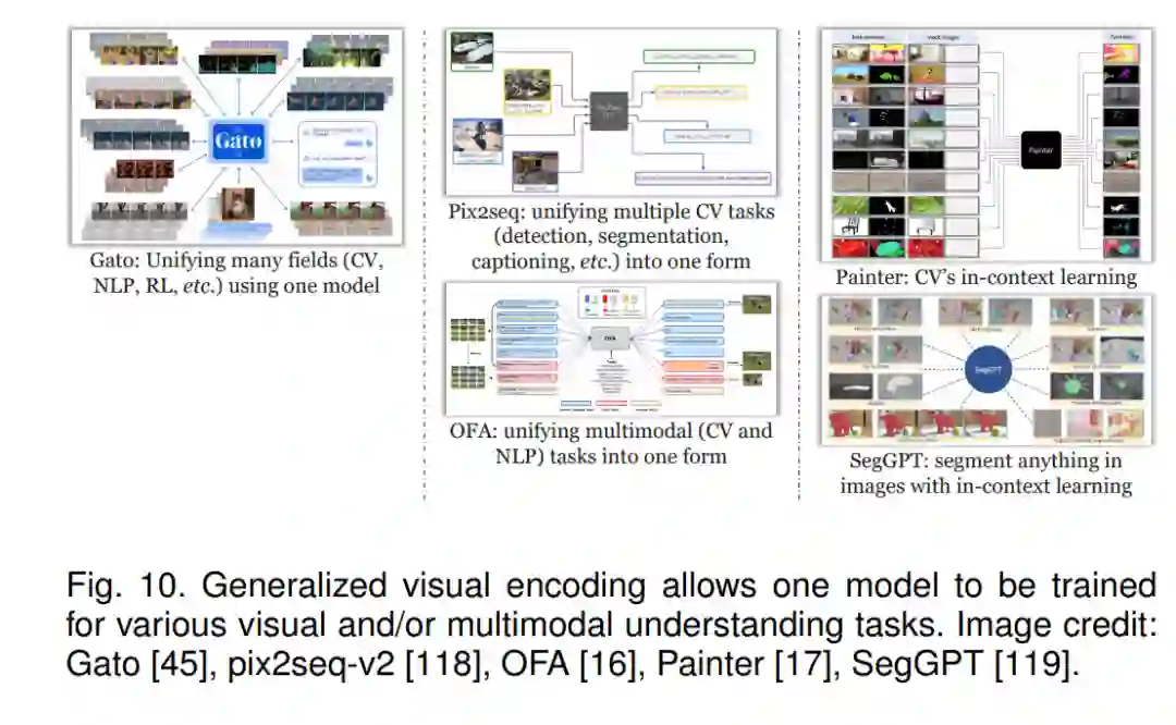 另一种统一计算机视觉任务的方式是为它们提供一个通用的视觉编码。有几种方法可以实现这个目标。一个关键的困难在于视觉任务之间的巨大差异,例如,对象检测需要一组边界框,而语义分割需要对整个图像进行密集预测,这两者都与图像分类所需的单个标签非常不同。正如我们都能理解的,自然语言提供了一种统一的形式来表示所有事物。一个名为 pix2seq [15] 的早期工作显示,对象检测结果(即边界框)可以被形式化为自然语言和坐标,然后转换为视觉模型的输出标记。在稍后的版本,pix2seq-v2 中,他们将表示形式一般化,以统一对象检测、实例分割、关键点检测和图像字幕的输出。类似的想法也被用于其他的图像识别 [120]、视频识别 [121] 和多模态理解 [16],[122],[123] 任务。