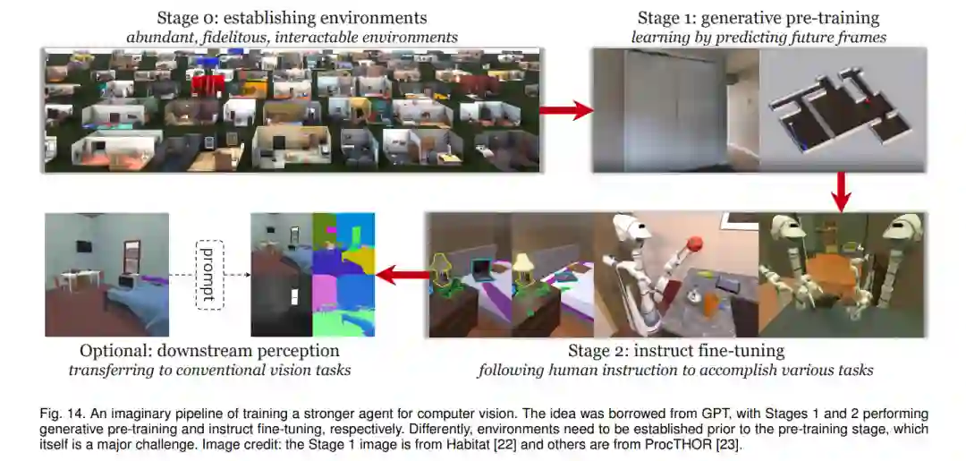 •** 第0阶段:建立环境**。正如前面的分析,高质量的环境对于计算机视觉(CV)中的人工通用智能(AGI)是非常必要的。这里的"高质量"概念包括但不限于丰富性(应该有充足和多样化的环境)、真实性(视觉外观和其他代理的行为应接近真实世界)以及交互性的丰富性(代理可以通过与环境交互来执行广泛的任务)。