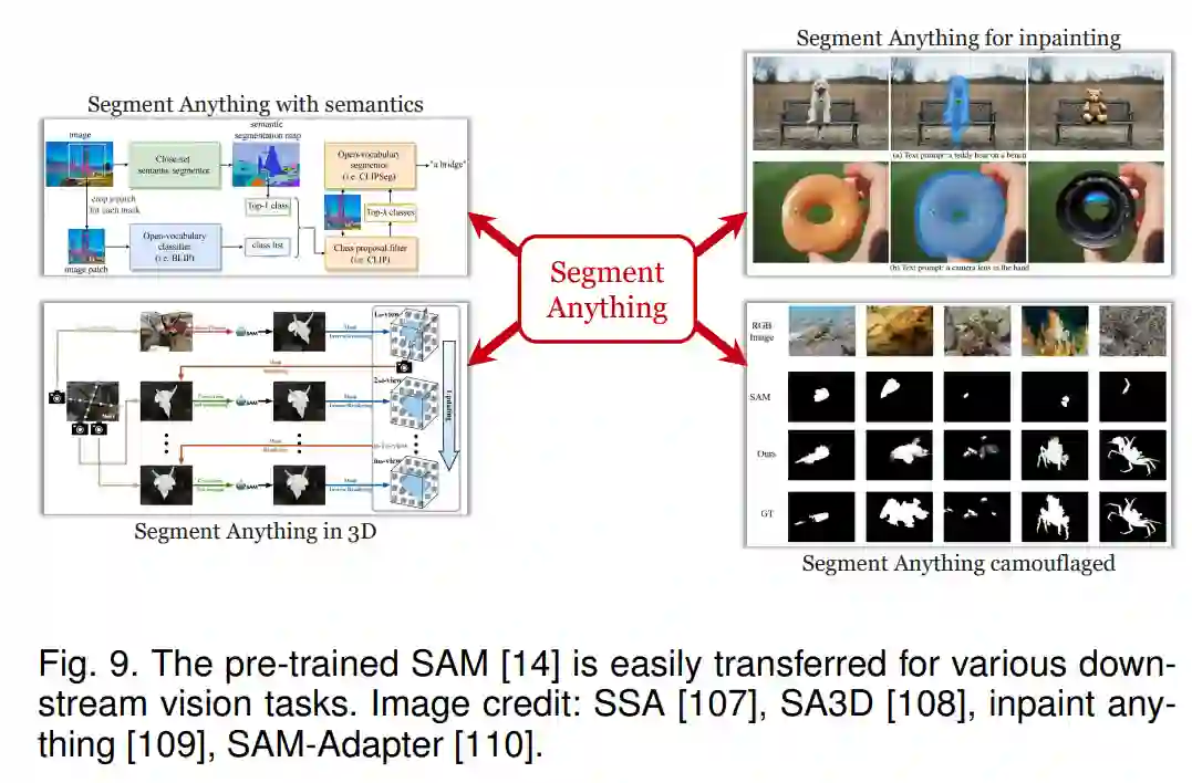 "分割任何事物"任务 [14] 最近被引入作为一个通用模块,将原始图像像素聚类为多个组,其中许多对应于图像中的基本视觉单元。该任务支持包括点、轮廓、文本等在内的多种提示,并为每个提示或每个提示的组合产生一些掩码和分数。该模型,SAM,在一个包含约1000万图像的大规模数据集上进行了训练,能够转移到广泛的分割任务,包括医学图像分析 [111],[112],[113],伪装对象分割 [110],[114],3D对象分割 [108],对象跟踪 [115],以及应用场景如图像修复 [109]。SAM也可以与最先进的视觉识别算法一起使用,例如将视觉接地 [116] 算法产生的边界框精炼为掩码,并将分割的单元输入到开放集分类算法中进行图像标记 [107],[117]。