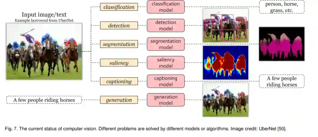 我们期望有一个CV算法能解决一般性任务,可能通过与环境的交互。注意,这个要求不仅限于识别所有事物或者基于图像或视频片段进行对话。它应该是一个全面的系统,接收来自人类的通用命令并产生所需的结果。但是,当前的CV状态还很初级。如图7所示,CV社区一直在为不同的视觉任务使用不同的模块甚至系统。