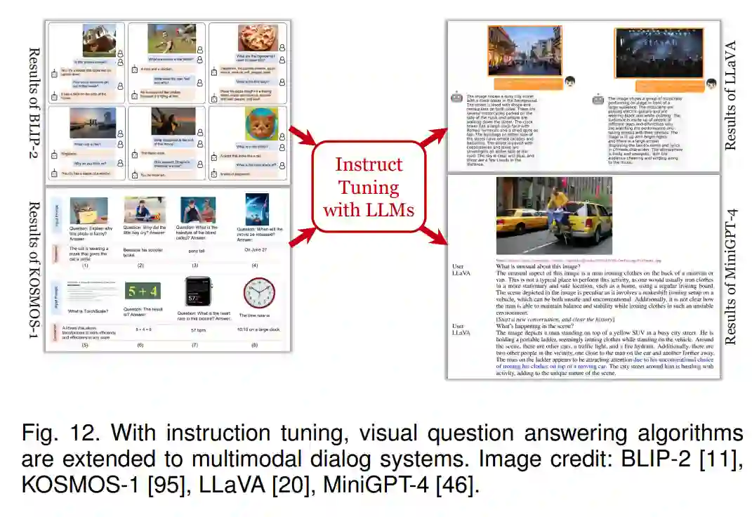 多模态对话将基于文本的对话扩展到视觉领域。早期的工作涉及到视觉问题回答,其中构建了各种简单问题的数据集 [128],[129],[130]。随着LLMs的快速发展,通过对预训练的视觉和语言模型进行微调,实现了多轮问答 [11],[95]。还展示了在多模态中可以通过上下文学习 [76] 或使用GPT作为逻辑控制器 [131] 来回答各种问题。最近,在GPT系列中开发的一种新的范式,称为指导学习 [4],已被继承用于提高多模态对话的质量 [20],[46]。其思想是提供一些参考数据(例如,对象、描述)来自于基准标注或识别结果,并要求GPT模型生成指导数据(即,丰富的问答对)。通过这些数据(无需参考),用于视觉和语言的基础模型可以通过轻量级的网络模块(例如,Q-former [11])相互交互。多模态对话为计算机视觉提供了一个初步的交互性基准,但作为一个由语言引导的任务,它也具有开放世界视觉识别中分析的弱点(见第4.2.1节)。我们期望丰富查询形式的方法(例如,使用通用的视觉编码方法,参见第4.2.3节)可以将多模态对话推向更高的水平。
