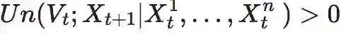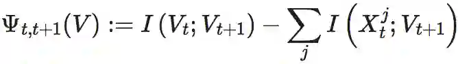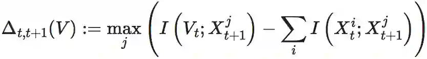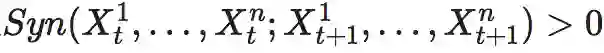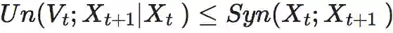 ,表示当前时刻的宏观态Vt能超过当前时刻的微观态Xt给下一时刻的整体系统Xt+1再多提供一些信息,存在因果涌现; 2)绕开了选择特定的宏观态Vt,仅仅基于系统当前时刻的微观态Xt和下一时刻的微观态Xt+1之间的协同信息定义因果涌现,当协同信息