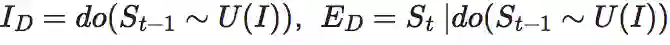 Hoel等[1][2]最早提出因果涌现理论,右图是对该理论框架的一个抽象,其中,横坐标表示时间尺度,纵坐标表示空间尺度。该框架可以看成是一个多层级的系统,存在微观和宏观两种状态。由于微观态往往具有很大的噪音,导致微观动力学的因果性比较弱,所以如果能对微观态进行合适的粗粒化得到噪音更小的宏观态,从而能使得宏观动力学的因果性更强。此外,因果涌现现象的发生意味着,当粗粒化微观状态时,从当前状态传递到下一状态的有效信息量会增加。 因果涌现理论框架 作者借鉴了整合信息的量化方法[17],提出一种因果效应度量指标有效信息(EI)来量化一个马尔可夫动力学的因果性强弱,该指标反应一个特定的状态如何有效地影响系统的未来状态,是系统动力学的内禀属性。具体来说,使用干预操作对上一时刻的状态做干预,然后计算干预分布与在干预的情况下经过动力学的下一时刻分布两者之间的互信息作为因果效应的度量指标, EI的计算公式如下所示: