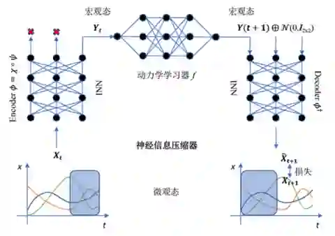 其中ξ表示系统中的噪音。 为了识别系统中的因果涌现,作者提出一种神经信息压缩方法,构建Encoder-Dynamic Learning-Decoder框架,该模型由编码器、动力学学习器以及解码器三个部分构成,用神经网络构建动力学学习器(f),用可逆神经网络(INN)构建编码器(Encoder)和解码器(Decoder)。该模型框架可以看成是一个神经信息压缩器(Neural Information Squeezer,NIS),将包含噪音的微观态压缩成宏观态,丢弃无用的信息,从而使得宏观动力学的因果性更强。NIS方法的模型框架如图所示。 NIS 模型框架图 具体来说,模型输入是微观状态
