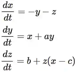 上述的三个例子都是针对离散的状态系统的因果涌现衡量,Varley尝试将连续系统转换成离散的状态转移图进行比较[21]。作者使用OPN(有序划分网络)方法来离散化Rossler吸引子来创建有限数量的状态以及定义一个状态到另一个状态的转移概率。Rossler吸引子的动力学如下所示: