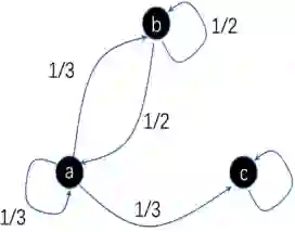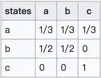 这是一个离散时间离散状态(S={a,b,c})的马尔可夫动力学中的状态概率转移矩阵,其中每一行、列都对应一个状态,第i行第j列表示状态从第i个状态转移到第j个状态的概率。我们也可以等价地用状态转移图来表示。
