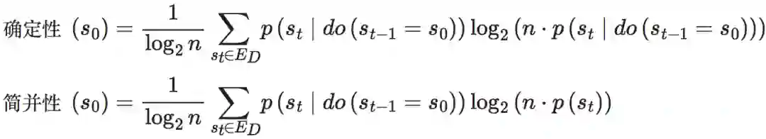 其中st-1和st分别表示t−1和t时刻的系统状态, ,这里do操作表示对状态进行干预并且强行设定上一时刻的状态st-1为均匀分布,这里I表示系统的状态空间,U(I)表示空间上的均匀分布。进行干预操作是为了使得有效信息能客观衡量动力学的因果特性而不受原始输入数据的分布影响。为了消除状态空间大小对有效信息的影响,使得比较不同的尺度下的有效信息是有意义的,作者定义了一个归一化指标有效系数来衡量动力学的因果性强弱,有效系数和有效信息有如下关系: