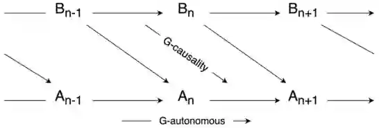 G-emergence理论是Seth于2008年提出的最早对涌现进行定量量化的研究之一[13],基本思想是用非线性格兰杰因果来量化复杂系统中的弱涌现。具体来说,使用二元自回归模型进行预测,当只存在两个变量A和B时,自回归模型存在两个等式,每个等式对应其中一个变量每个时刻值的构成,每个变量的当前时刻值都是由自身变量和另外一个变量在滞后时间范围内的变量以及残差项构成,残差可以理解为预测误差,残差可以用来衡量格兰杰因果(G-causality)的因果效应程度。B作为A的格兰杰因(G-cause)的程度通过两个残差方差之比的对数来计算,其中一个是在省略B的所有项时A的自回归模型的残差,另一个是全预测模型的残差。此外,作者还定义了G-autonomous,表示一个时间序列的过去值可以帮助预测自身的未来值。G-autonomous的程度可以用类似量化格兰因果的方法来测量。 G-emergence 理论图 基于上述G-causality中的两个基本概念,可以来判断涌现的发生 (这里是基于格兰杰因果的涌现的衡量,记作G-emergence)。如果把A理解为宏观变量,B理解为微观变量。发生涌现的条件包含两个:1)A是关于B的G-autonomous;2)B是A的G-cause。其中G-emergence的程度是通过A的G-autonomous的程度与B的平均G-cause的程度的乘积来计算。 Seth提出的G-emergence理论首次尝试使用因果关系来量化涌现现象****,然而,作者使用的因果关系是格兰杰因果,这不是一个严格的因果关系,同时结果也取决于所使用的回归方法。此外,方法的度量指标是根据变量而不是动力学定义的,这意味着结果会依赖于变量的选择。因此,该方法还存在很多不足,Erik等人提出的因果涌现框架能有效解决这些问题。 关于G-emergence理论、涌现的分类、因果涌现的辨识等更多话题,可以观看因果涌现读书会的分享:张江、袁冰:涌现、因果与人工智能https://pattern.swarma.org/study_group_issue/490