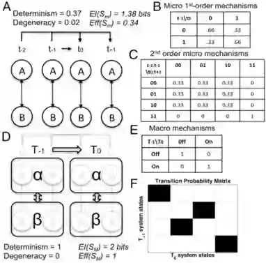 除了对空间进行粗粒化,还可以对时间进行粗粒化如下图所示,考虑两阶马尔可夫动力学,输入为两个时刻t−2和t−1的状态,输出为t和t+1的状态,可以通过EI计算二阶微观动力学的有效信息为1.38bits,然后通过对时间状态分组,令α={At,At+1},β={Bt,Bt+1}, 同时采用与离散布尔网络相同的映射函数,可以得到完全确定且非简并的宏观动力学系统,其有效信息为2 bits,同样实现“宏观打败微观”的效果。 时域空间上的因果涌现