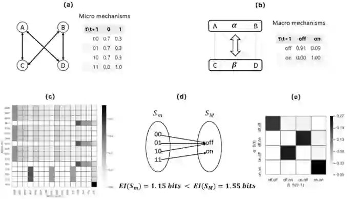 下图展示1个含有4个节点的布尔网络例子,每个节点有0和1两种状态,每个节点与其中两个节点相连,遵循相同的微观动力学机制(a图),因此,一共含有十六个微观状态,可以得到一个16×16的状态转移矩阵(c图),然后给定分组方式,如将A和B进行合并,C和D进行合并(b图),同时给定微观状态到宏观状态的映射函数(d图),就可以得到新的宏观动力学机制,根据这个机制就可以得到宏观网络的状态转移矩阵(e图),通过对比发现宏观动力学的有效信息大于微观动力学的有效信息(EI(SM)>EI(Sm)),系统发生了因果涌现。 离散布尔网络上的因果涌现