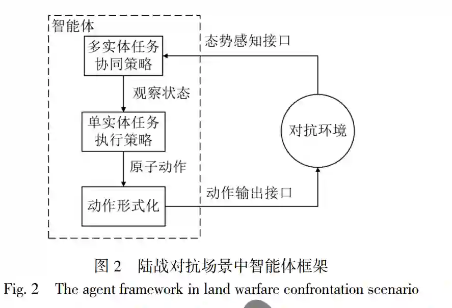 针对陆战对抗中智能体状态动作空间复杂和行为模式固定的问题, 提出任务分层架构下的博弈策略生成方法. 使用策略 式博弈模型对陆战对抗问题进行分析建模, 给出智能体任务执行中的收益矩阵构建方法, 并通过求解混合策略, 使智能体行为同 时具有合理性和多样性. 以陆军战术对抗兵棋推演为平台进行测试, 实验证明智能体策略可解释性强, 行为模式多样, 在与 AI 和 人类选手对抗时都具有较高的胜率. 智能体是人工智能的一个基本术语, 广义的智 能体包括人类、机器人、软件程序等[1] . 狭义的智能 体是能感知环境, 根据环境变化作出合理判断和行 动, 从而实现某些目标的计算机程序. 从感知序列集 合到执行动作集合的映射也称为智能体的策略[2] . 智 能体策略的研究对实现无人系统自主能力[3]和人机混 合智能[4]具有重要意义. 决策指根据一定目标选择备选方案或动作的过 程. 传统使用脚本规则[5]、有限状态机[6]、行为树[7]等 方法进行智能体决策行为建模, 决策模型对应了智 能体的策略. 这类智能体的策略具有较强的可解释 性, 但是其需要大量的领域专家知识. 另一方面上述 智能体通常使用基于专家知识的纯策略, 其行为模 式是固定的, 在复杂对抗场景中存在适应性不强和 灵活度不够的问题. 近年, 深度强化学习成为智能体 策略生成的重要方法, 在 Atari 游戏[8]、围棋[9-11]、德 州扑克[12]、无人驾驶[13]等领域取得了突破进展, 部分 场景中已经达到或超越了人类专家水平. 然而基于 强化学习的智能体在更为复杂的场景中面临着感知 状态空间巨大、奖励稀疏、长程决策动作组合空间 爆炸等难题[14] . 战争对抗作为一种复杂对抗场景, 一直是智能 体策略生成研究的重点, 并越来越受到关注[15-17] , 但 当前研究还缺少实质性的进展, 特别是在人机对抗 中[18] , 人类对手策略变化造成的环境非静态性会使智 能体显得呆板、缺少应变能力. 针对陆军战术级对抗场景中智能体状态动作空 间复杂和行为模式固定的问题, 以中科院“庙算·智胜 即时策略人机对抗平台”陆军战术对抗兵棋(以下简 称“庙算”陆战对抗兵棋)为实验平台, 提出了基于博 弈混合策略的智能体对抗策略生成方法. 本文工作 主要有 3 个方面: 1)对陆战对抗中实体动作进行抽象、分层, 建 立智能体任务分层框架, 降低问题求解的复杂度. 2)对陆战对抗实体任务中关键要素进行分析, 构建对抗问题博弈模型, 并给出收益矩阵的计算 方法. 3)给出陆战对抗兵棋推演场景中智能体混合策略均衡的求解方法, 对本文所提方法的可行性进行 了验证.