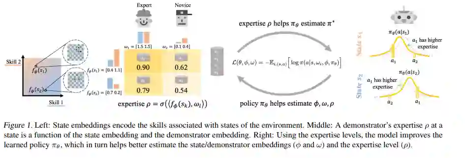 许多现有的模仿学习数据集是从多个演示者那里收集的,每个演示者在环境的不同部分具有不同的专长。然而,标准的模仿学习算法通常将所有演示者视为同质的,而不考虑他们的专业知识,吸收任何次优演示者的弱点。在这项工作中,我们表明,在演示者专业知识上的无监督学习可以导致模仿学习算法性能的持续提高。我们根据经验丰富的策略和演示者的专业水平,开发和优化一个联合模型。这使得我们的模型能够从最优行为中学习,并过滤掉每个演示者的次优行为。我们的模型学习了一个单一的策略,这个策略甚至可以超过最好的演示者,并且可以用来评估任何状态下任何演示者的专业知识。我们阐述了我们在Robomimic和离散环境(如MiniGrid和国际象棋)中对真实机器人连续控制任务的研究结果,在23个设置中有21个优于竞争方法,在最终奖励方面平均提高7%,最高提高60%。