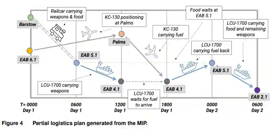 为设计此决策支持工具,构建了一个混合整数规划(MIP)模型,以优化多式联运远征后勤网络内连接载具和物资的路径规划与调度。该混合整数规划(MIP)旨在最小化因延迟履行需求而产生的惩罚,同时考虑关键特征,如连接载具容量、运输和维护时间、地点容量以及物资可获得性。该混合整数规划(MIP)模型结合了现实的后勤约束和目标。然后,在一个设定在南加州、旨在反映美国海军陆战队(USMC)训练场景的虚构远征想定中测试模型。结果表明了所提出的混合整数规划(MIP)在协调后勤资产以及时满足需求方面的实际适用性和有效性。通过关键绩效指标,本文所述工具为后勤资产的最优利用提供了宝贵的见解。通过进行假设情景实验,还展示了其快速调整后勤计划的能力,同时识别后勤网络中的脆弱性。重要的是,工具已在美国海军陆战队(USMC)进行的保密兵棋推演中得到使用和验证。
