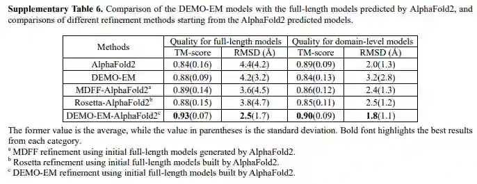 作者还将 AlphaFold2 构建的相同全长模型输入 MDFF、Rosetta 和 DEMO-EM,以检查灵活组装和细化过程的性能。所有方法都改进了初始全长模型,即使对于最佳预测模型,也显示了冷冻电镜数据的有用性。