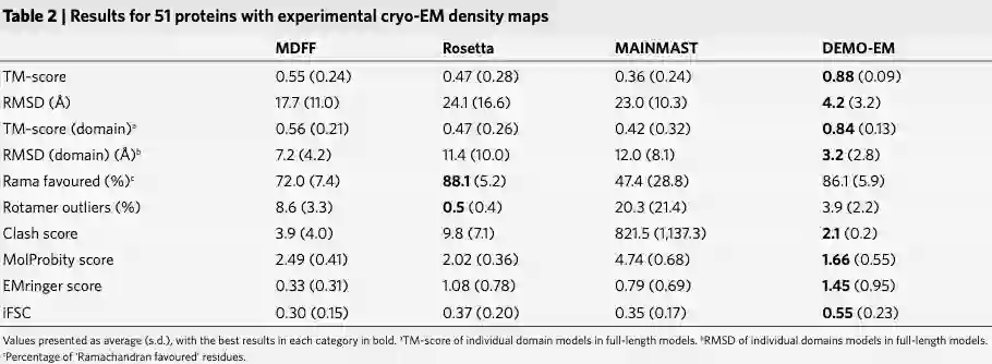 该方法在包含多达 12 个连续和不连续结构域的大规模蛋白质基准集上进行了测试,这些结构域具有中到低分辨率的密度图,其中,对于 97% 的案例,DEMO-EM 生成的模型具有正确的域间方向(模板建模分数(TM 分数)>0.5),并且优于最先进的方法。