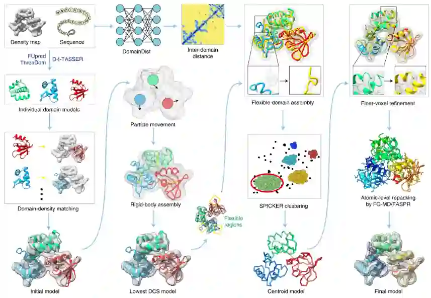 从查询序列开始,域边界****首先由FUpred和ThraDom预测,每个域的模型由DI-TASSER生成。同时,使用深度学习卷积网络DomainDist预测域间距离。其次,每个域模型都通过拟牛顿搜索独立地拟合到密度图。第三,初始全长模型通过两步刚体REMC模拟优化****,以最小密度图和全长模型之间的DCS。第四,使用由DCS、域间距离分布和基于知识的力场引导的REMC模拟,通过原子级、分段级和域级精调的柔性装配对从刚体装配模拟中选择的最低DCS模型进行精调,得到decopy构象由SPICKER聚类以获得质心模型。最后,对全原子模型再次进行柔性装配模拟,其中质心模型的约束增加了能量,最终模型是用FASPR和FG-MD侧链重新包装后的最低能量模型构建。