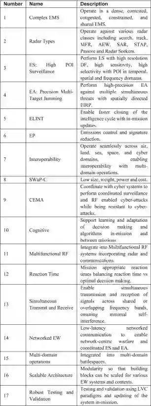 这些需求涵盖多项关键功能:在复杂电磁环境中作战、实现无缝多域互操作、集成先进认知与网络-电磁协同能力。架构强调模块化与可扩展设计,确保在多样化作战场景中的适应性,同时满足低尺寸、低重量、低功耗与低成本约束。