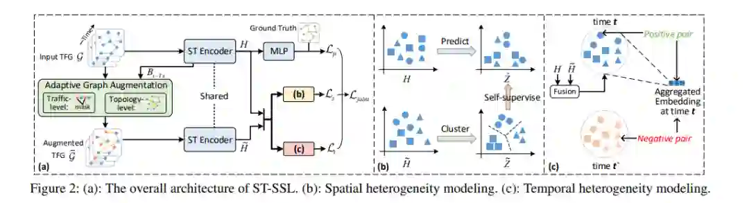 城市不同时段交通流量的鲁棒预测在智能交通系统中起着至关重要的作用。尽管已有工作在建模时空相关性方面做了大量工作,但现有方法仍然存在两个关键局限性:i)大多数模型都是集体预测所有区域的流量,没有考虑空间异质性,即不同区域可能存在交通流分布的倾斜。ii) 这些模型无法捕捉由时变交通模式引起的时间异质性,因为它们通常对所有时间段的共享参数空间的时间相关性进行建模。为了应对这些挑战,本文提出了一种新的时空自监督学习(ST-SSL)流量预测框架,通过辅助的自监督学习范式,增强了流量模式表示,以反映空间和时间的异质性。ST-SSL建立在一个集成模块上,具有时间和空间卷积,用于编码跨空间和时间的信息。为了实现自适应时空自监督学习,ST-SSL首先在属性和结构两个层次上对交通流图数据进行自适应增强。在增强的流量图之上,构建两个SSL辅助任务,以空间和时间异构感知增强来补充主要的流量预测任务。在四个基准数据集上的实验表明,ST-SSL的性能始终优于各种最新的基线。由于时空异构在实际数据集中广泛存在,所提出的框架也可以为其他时空应用提供启发。模型实现可以在https://github.com/Echo-Ji/ST-SSL上找到。