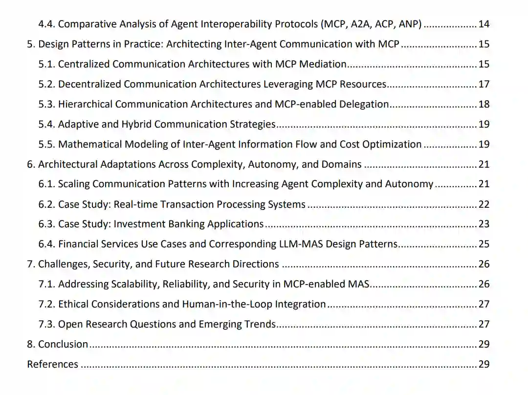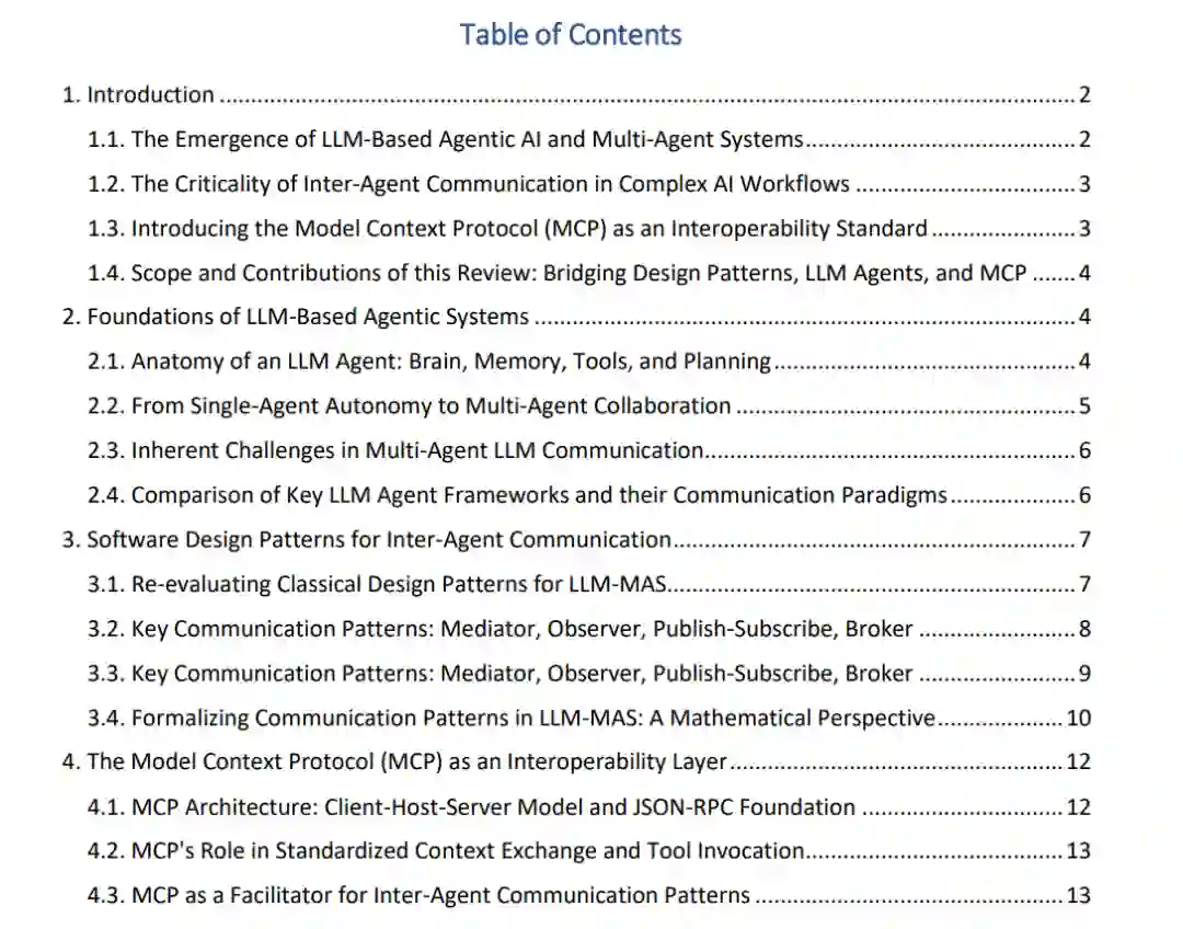 本综述融合了大型语言模型(LLM)驱动的智能体式 AI、经典软件设计方法论,以及新兴的模型上下文协议(MCP)三方面的研究进展,目标是为构建鲁棒、可扩展的智能体间通信框架提供系统性指导。 本文探讨了如何将久经验证的软件架构设计模式,适配到以 LLM 为基础的现代多智能体系统中,并将 MCP 定位为推动互操作性与结构化协作的核心支柱。 通过理论模型与概念图示,本文分析了通信动态、系统复杂度与数据交换效率。同时,本文还评估了这些设计策略如何在面对智能体自主性提升与系统复杂化时保持可扩展性。 文章还结合实时金融系统与投资平台等现实应用场景,展示在这些关键领域中,强健的智能体协同架构如何满足运行需求。最终,本文旨在为开发者与系统架构师提供一个切实可行的框架,用于构建安全、高效、可维护的基于 LLM 的多智能体生态系统。