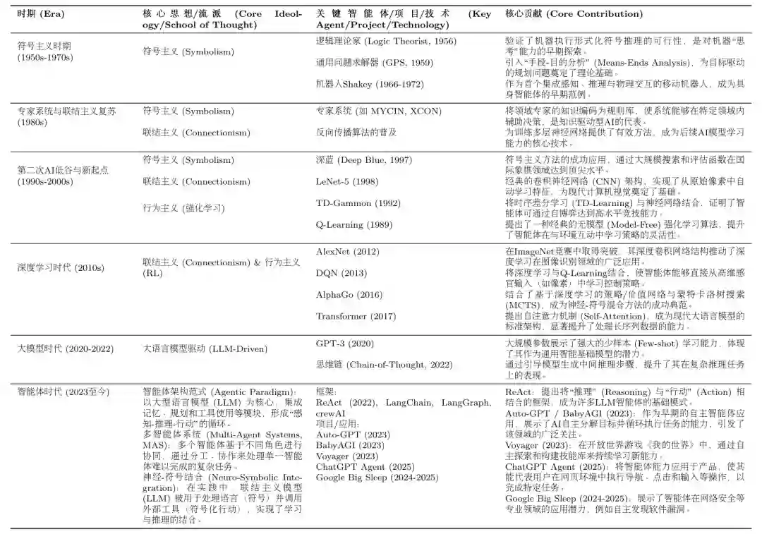 进入21世纪20年代,这些思想流派以前所未有的方式深度融合。以GPT系列为代表的大语言模型,其本身是联结主义的产物,却成为了执行符号推理、进行工具调用和规划决策的核心“大脑”,形成了神经-符号结合的现代智能体架构。为了系统性地回顾这一发展脉络,下图2.11梳理了从20世纪50年代至今,人工智能体发展史上的关键理论、项目与事件,为读者提供一个清晰的全局概览,作为本章知识的沉淀。