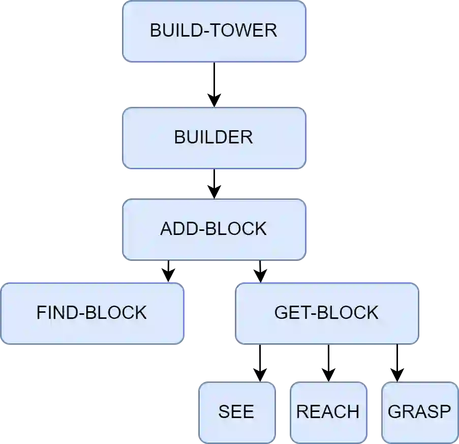图 2.6 “心智社会”中搭建积木塔行为的涌现机制示意图 让我们以经典的“搭建积木塔”任务为例,来说明这一过程,如图2.6所示。当一个高层目标(如“我要搭一个塔”)出现时,它会激活一个名为BUILD-TOWER的高层机构。