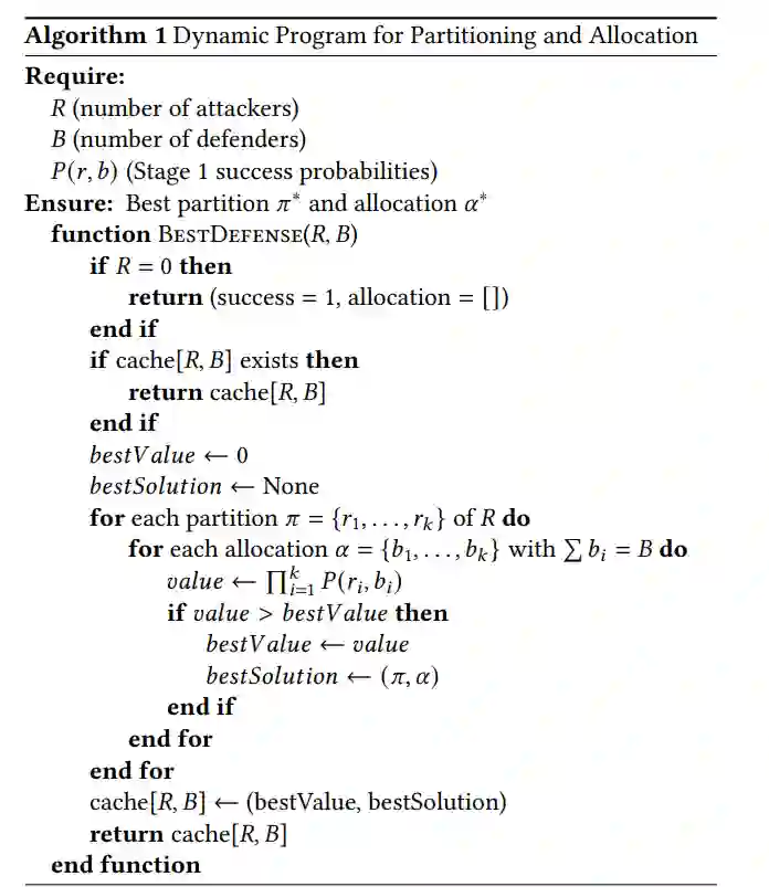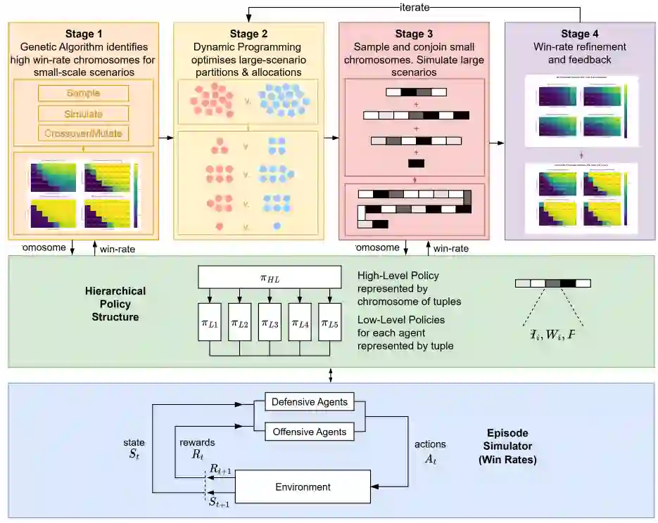 (1)一种用于可扩展防御的遗传算法-动态规划混合框架。提出了一个框架,该框架结合了遗传算法(在小规模交战中演化有效染色体)和动态规划(将这些染色体组装成应对更大规模蜂群的策略)。这使得在朴素进化方法无法达到的规模上进行可处理的分析成为可能。