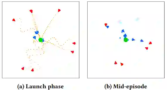 图1:场景中包含10名防御者(蓝色)保护一个目标(绿色)免受8名攻击者(红色)的攻击。在(a)中,攻击者及其朝向目标的进攻路径(橙色)一同显示。在(b)中,已发生碰撞不再参与战斗的无人机颜色变暗。