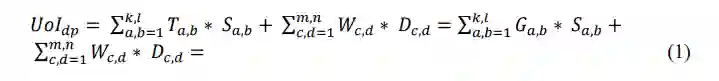 公式 1. UoI 计算,其中 dp 为决策点,D 为变量,表示可能是任务关键因素的决策组成部分,W 为与这些组成部分的重要性相关的权重,T 为分类权重类别(相当于 G),S 为数据来源类别。UoI 值表示数据源和因素对所分类的不确定性的贡献。