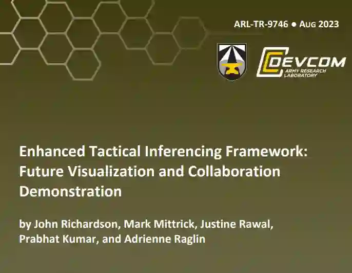 本报告介绍了美国陆军研究实验室内容理解处的研究人员在 2023 财年为采用增强型战术推理(ETI)框架所做的工作。ETI 的开发旨在支持多智能体环境(数据源智能体、推理模型智能体和决策者智能体)中人工推理研究的实验和演示。在本报告中,ETI 被用于在跨现实环境中演示基于不确定性的决策推荐功能。从模拟场景的数据开始,再加上额外的外部环境,ETI 智能体对态势感知信息中的不确定性进行推理,为决策者提供建议选择。最后,ETI 的产品被转化为跨现实可视化,以探索新的人机交互模式。