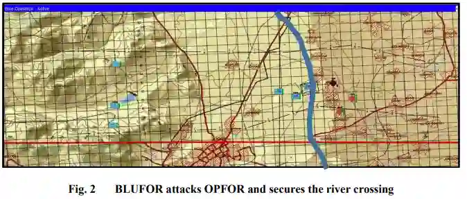 在该场景中,蓝军(BLUFOR)的目标是向东推进,穿过阿塞拜疆名为阿格达姆区的地区,同时与部署在河东的对方部队(OPFOR)交战并将其消灭。(见图 1)