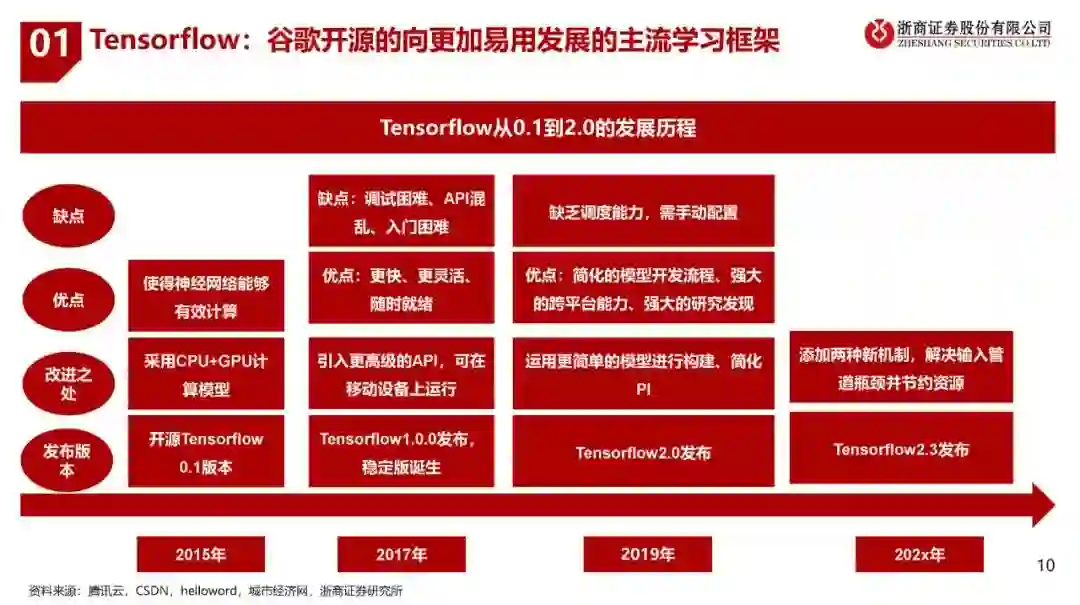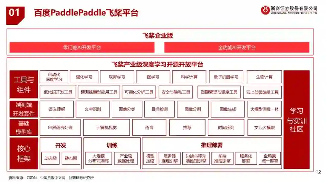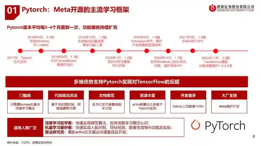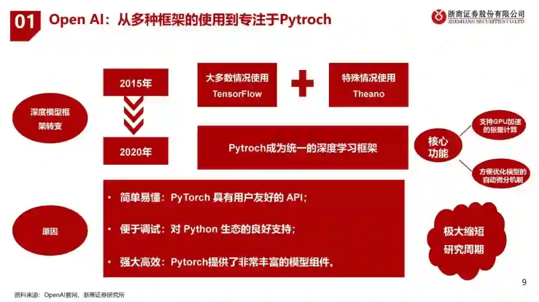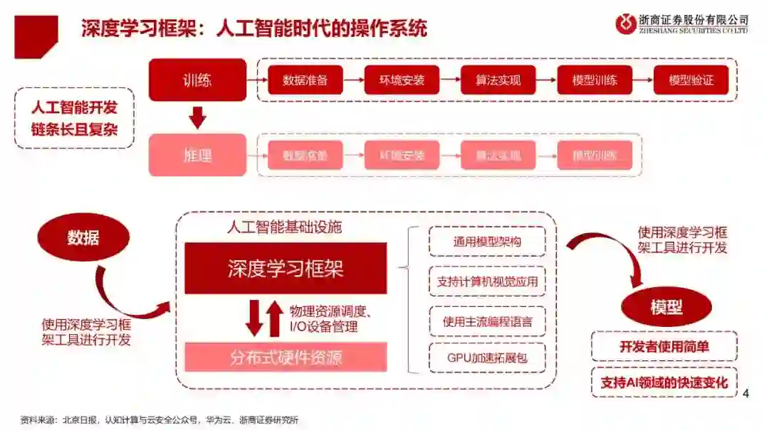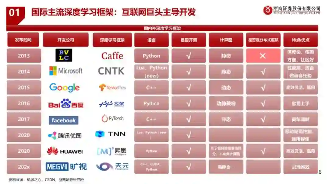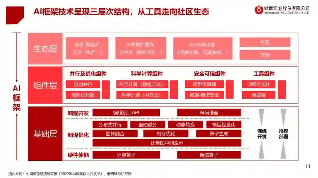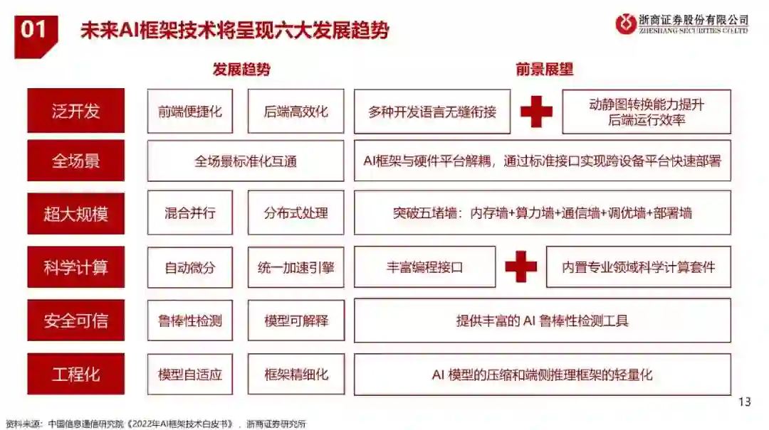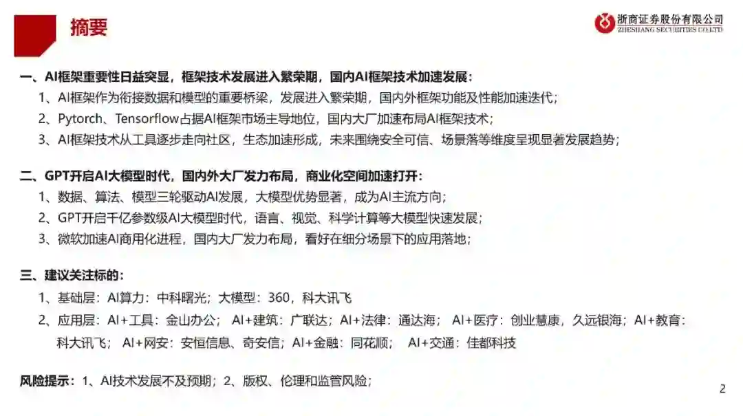 一、AI框架重要性日益突显,框架技术发展进入繁荣期,国内AI框架技术加速发展: 1、AI框架作为衔接数据和模型的重要桥梁,发展进入繁荣期,国内外框架功能及性能加速迭代; 2、Pytorch、Tensorflow占据AI框架市场主导地位,国内大厂加速布局AI框架技术; 3、AI框架技术从工具逐步走向社区,生态加速形成,未来围绕安全可信、场景落等维度呈现显著发展趋势; 二、GPT开启AI大模型时代,国内外大厂发力布局,商业化空间加速打开: 1、数据、算法、模型三轮驱动AI发展,大模型优势显著,成为AI主流方向; 2、GPT开启千亿参数级AI大模型时代,语言、视觉、科学计算等大模型快速发展; 3、微软加速AI商用化进程,国内大厂发力布局,看好在细分场景下的应用落地; 三、建议关注标的: 1、基础层:AI算力:中科曙光;大模型:360,科大讯飞 2、应用层:AI+工具:金山办公;AI+建筑:广联达;AI+法律:通达海;AI+医疗:创业慧康,久远银海;AI+教育:科大讯飞;AI+网安:安恒信息、奇安信;AI+金融:同花顺;AI+交通:佳都科技
