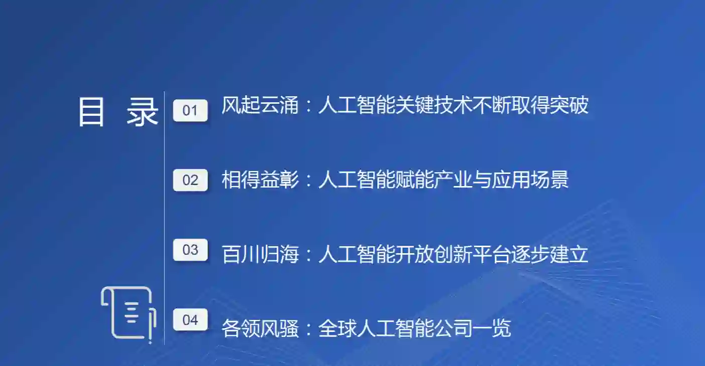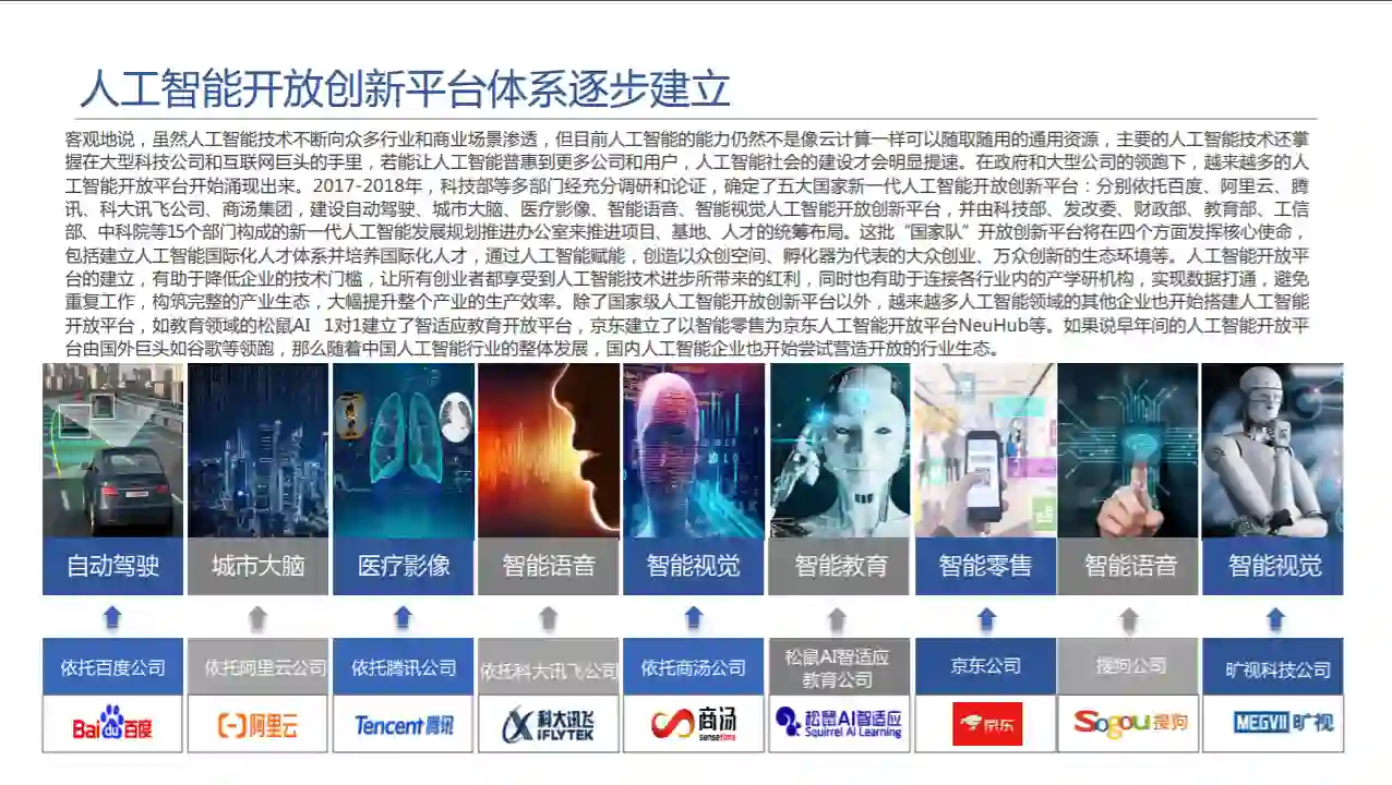 我国发展人工智能具有多个方面的优势,比如开放的市场环境、海量的数据资源、强有力的战略引领和政策支持、丰富的应用场景等,但仍存在基础研究和原创算法薄弱、高端元器件缺乏、没有具备国际影响力的人工智能开放平台等短板。此份报告不但对人工智能关键技术(计算机视觉技术、自然语言处理技术、跨媒体分析推理技术、智适应学习技术、群体智能技术、自主无人系统技术、智能芯片技术、脑机接口技术等)、人工智能典型应用产业与场景(安防、金融、零售、交通、教育、医疗、制造、健康等)做出了梳理,而且同时强调人工智能开放平台的重要性,并列举百度Apollo开放平台、阿里云城市大脑、腾讯觅影AI辅诊开放平台、科大讯飞智能语音开放创新平台、商汤智能视觉开放创新平台、松鼠AI智适应教育开放平台、京东人工智能开放平台NeuHub、搜狗人工智能开放平台等典型案例呈现给读者。最后,列举国内外优秀的人工智能公司与读者共勉。随着技术的进步、应用场景的丰富、开放平台的涌现和人工智能公司的创新活动,我国整个人工智能行业的生态圈也会逐步完善,从而为智慧社会的建设贡献巨大力量。