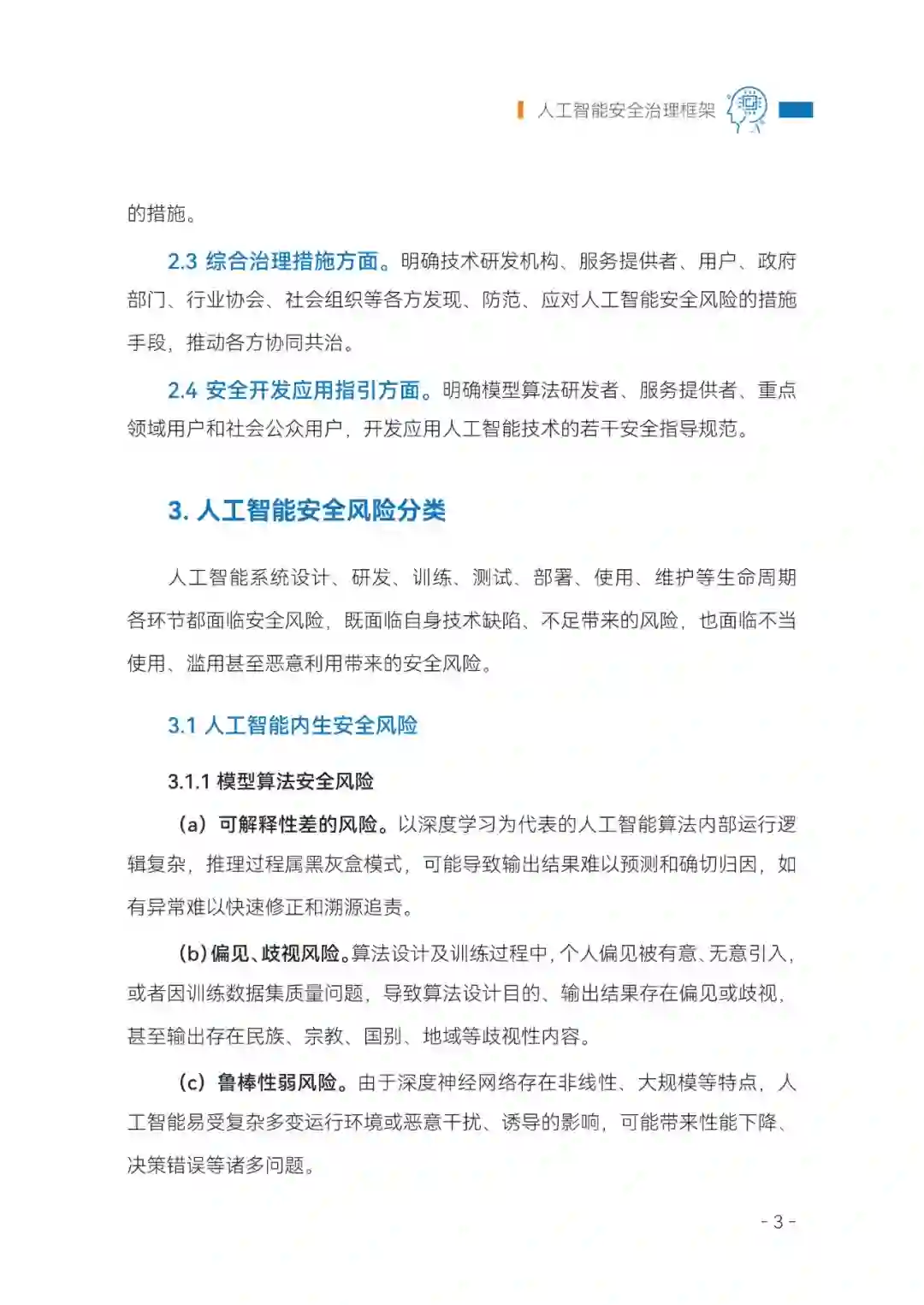 贯彻落实《全球人工智能治理倡议》,网安标委研究制定了《人工智能安全治理框架》(以下简称《框架》)。《框架》以鼓励人工智能创新发展为第一要务,以有效防范化解人工智能安全风险为出发点和落脚点,提出了包容审慎、确保安全,风险导向、敏捷治理,技管结合、协同应对,开放合作、共治共享等人工智能安全治理的原则。 《框架》按照风险管理的理念,紧密结合人工智能技术特性,分析人工智能风险来源和表现形式,针对模型算法安全、数据安全和系统安全等内生安全风险和网络域、现实域、认知域、伦理域等应用安全风险,提出相应技术应对和综合防治措施,以及人工智能安全开发应用指引。 网安标委秘书处主要负责人表示,《框架》1.0版的发布,对推动社会各方积极参与、协同推进人工智能安全治理具有重要促进作用,为培育安全、可靠、公平、透明的人工智能技术研发和应用生态,促进人工智能的健康发展和规范应用,提供了基础性、框架性技术指南。同时,也有助于在全球范围推动人工智能安全治理国际合作,推动形成具有广泛共识的全球人工智能治理体系,确保人工智能技术造福于人类。 ** 文件全文**