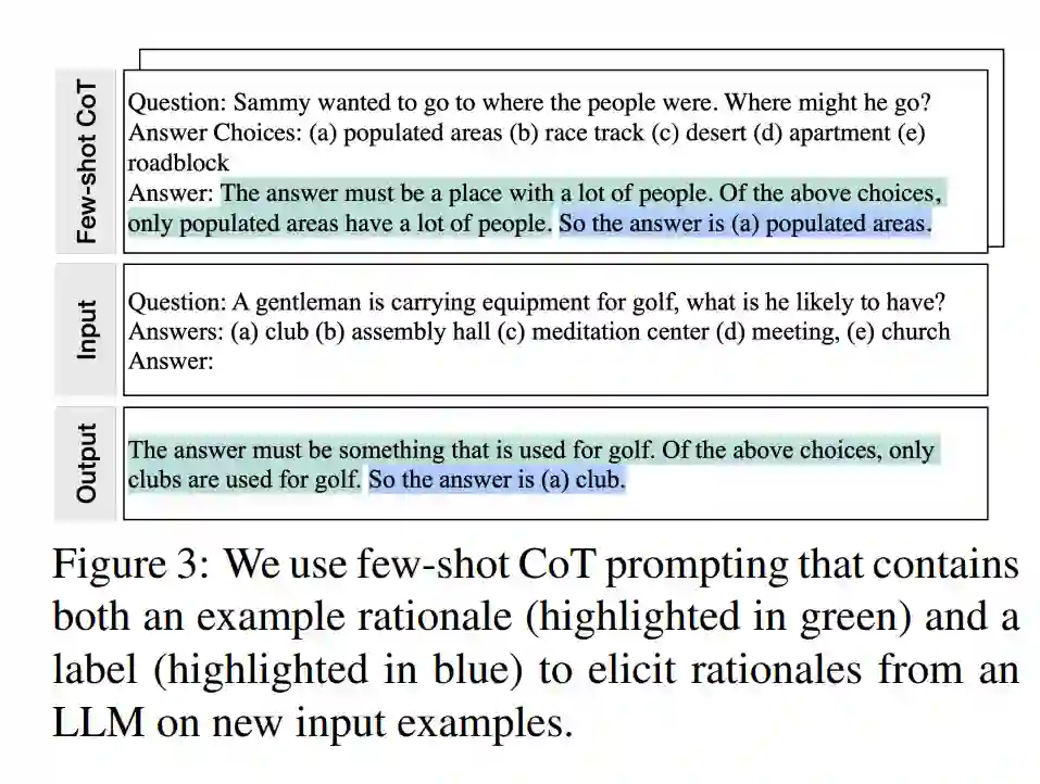 最近的研究发现LLMs有一个有趣的新兴特性:它们能够生成支持其预测的rationales(Wei等人,2022;Kojima等人,2022)。虽然这些研究主要关注如何从LLMs中引出这种推理能力(Nye等人,2021;Wei等人,2022;Kojima等人,2022),但我们在训练较小的下游模型时使用了它们。具体来说,我们利用链式思考(CoT)提示(Wei等人,2022)从LLMs中引出和提取rationales。