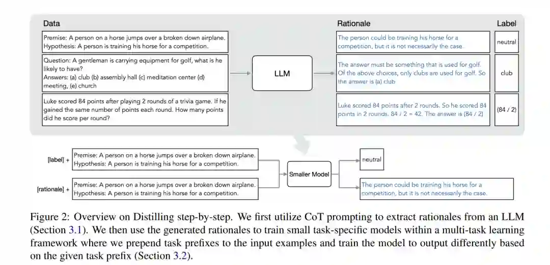 在这项工作中,我们引入逐步蒸馏,一种用更少训练数据训练较小模型的新型简单机制。我们的机制减少了将LLMs微调和蒸馏为较小模型所需的训练数据量。我们的机制的核心是从将LLMs视为嘈杂标签的来源转变为将它们视为可以推理的代理:LLMs可以生成自然语言rationales(基本原理/解释/依据),为其预测的标签辩护(Wei等人,2022;Kojima等人,2022)。例如,当被问到“一个绅士正在携带高尔夫球设备,他可能有什么?(a)球杆,(b)礼堂,(c)冥想中心,(d)会议,(e)教堂”时,LLM可以通过链式思考(CoT)推理(Wei等人,2022)回答“(a)球杆”,并通过陈述“答案必须是用于高尔夫球的东西。在上述选项中,只有球杆是用于高尔夫球的。”来合理化标签。我们使用这些提取的rationales(基本原理/解释/依据)作为额外的、更丰富的信息,在一个多任务训练设置中训练较小的模型,包括标签预测和rationales(基本原理/解释/依据)**预测(Raffel等人,2020;Narang等人,2020)。