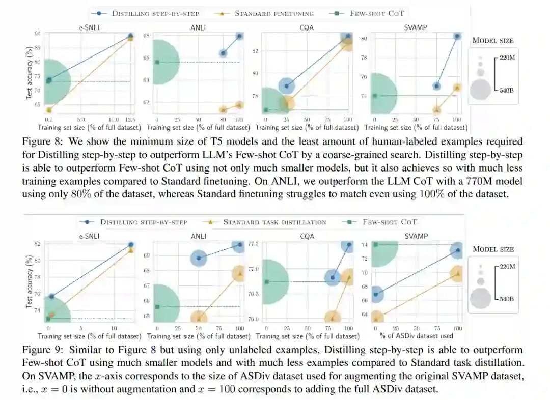 逐步蒸馏方法在使用更少数据的情况下,使用更小的模型超过LLMs。在图8中的所有数据集上,我们发现逐步蒸馏方法在使用更少的数据时,性能优于PaLM的少样本CoT,在只使用部分可用训练样本的情况下,使用更小的T5模型。具体来说,在e-SNLI上,逐步蒸馏方法可以在模型大小减小2000倍(220M T5)且只使用完整数据集的0.1%的情况下,实现比少样本CoT更好的性能。在图9中,只有无标签数据集可用时,我们观察到同样的趋势,即逐步蒸馏方法在大多数情况下,可以使用更小的模型和更少的数据超过少样本CoT。例如,在ANLI上,逐步蒸馏方法在模型缩小45倍且只使用完整无标签集50%的情况下,超过了LLM。标准微调和蒸馏需要更多的数据和更大的模型。最后,在图8和图9中,我们看到标准微调和蒸馏通常需要更多的数据或更大的模型来匹配LLM的性能。例如,在图8中的e-SNLI上,我们观察到逐步蒸馏方法在只使用数据集的0.1%的情况下就超过了LLM,而标准微调需要更多的数据来匹配性能。此外,在图8中的ANLI上,我们观察到逐步蒸馏方法可以在只使用80%的训练集的情况下,使用770M模型超过PaLM,而标准微调即使使用完整数据集也难以匹配LLM,因此需要更大的模型来缩小性能差距。