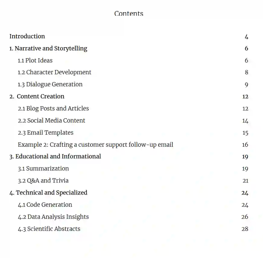 本电子书分为四个主要部分,每个部分都集中在生成式AI文本提示的特定应用上。每个部分都包含实用示例和技巧,以帮助您入门并充分利用这项技术。