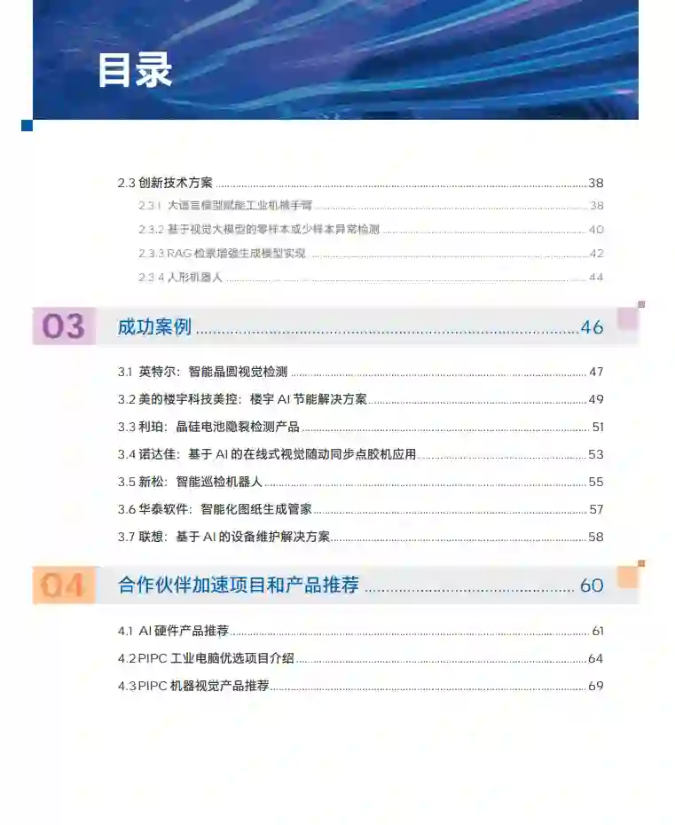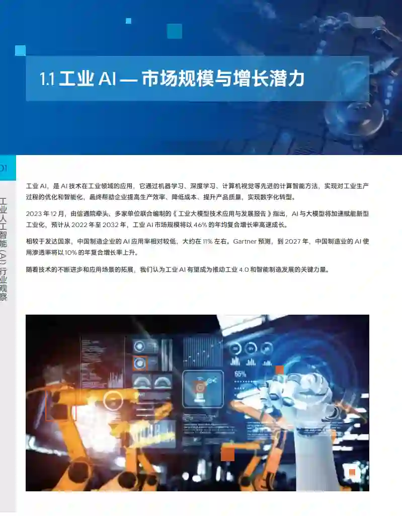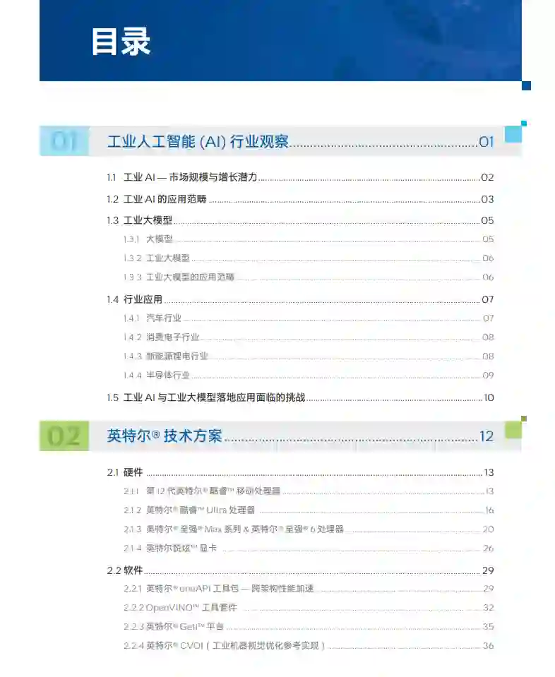 人工智能(AI)技术的快速发展掀起了新一轮工业革命浪潮,通用大模型的出现让AI技术从专用化迈向了通用化。AI技术正在步入工业领域的千行百业,帮助企业实现从传统的劳动密集型、资源密集型企业,向技术密集型、知识密集型的高端化、智能化、绿色化方向转型升级,打造依托于人工智能、大数据、云计算等现代信息技术的新质生产力。 工业AI和大模型的应用,已经渗透到工业生产的产品设计、企业流程管理规划、智能化生产、设备预测性维护、供应链优化、创新服务、绿色制造、智能客服等众多环节,它通过处理和分析海量工业数据,帮助企业在上述各个环节中做出最优的智能化决策,从而在多个环节全方位实现提质、增效、降本,增强竞争力。 在日趋激烈的工业市场竞争中,寻求部署新技术来提升综合竞争力,是企业的生存之道。而引领工业革命浪潮的AI技术和大模型,是企业从多维度重塑自身生产方式、实现新质生产力的关键。 通过这本白皮书,工业领域的企业和合作伙伴可以更系统、更全面地了解AI技术如何为工业制造的各个环节赋予怎样的智能化能力,以及英特尔在帮助企业落地部署AI技术方面所能提供的产品、平台和系统性支持与服务以及成功案例。 本白皮书中包括了工业AI和工业大模型的概念介绍、当前的市场规模与市场增长潜力、工业AI和工业大模型能为汽车、消费电子、新能源锂电、半导体制造等重点行业所带来的赋能创新机会,以及当前大模型在工业领域落地应用所面临的挑战和英特尔针对工业AI和大模型落地部署从硬件,到软件,到整体方案的技术赋能。 英特尔希望通过本白皮书,促进工业AI技术的广泛应用,并与行业伙伴共同探讨和制定工业AI的标准化流程和最佳实践,共同构建开放、协同的工业AI生态系统,推动制造业向智能制造转型升级,赋能新质生产力。