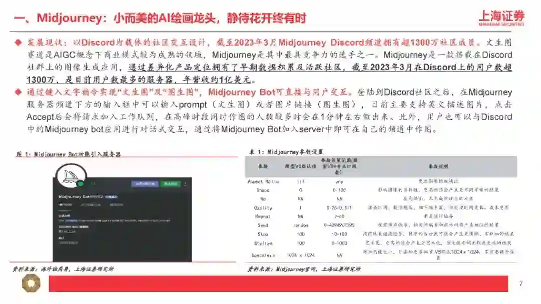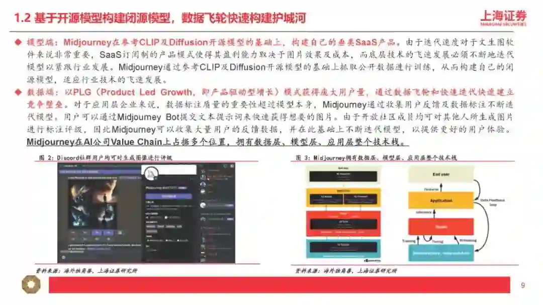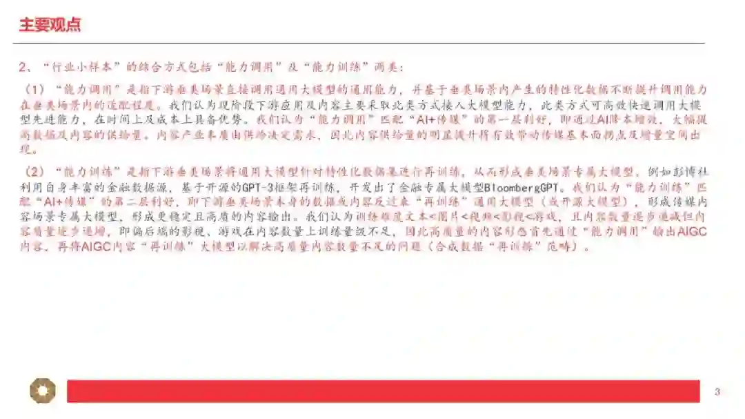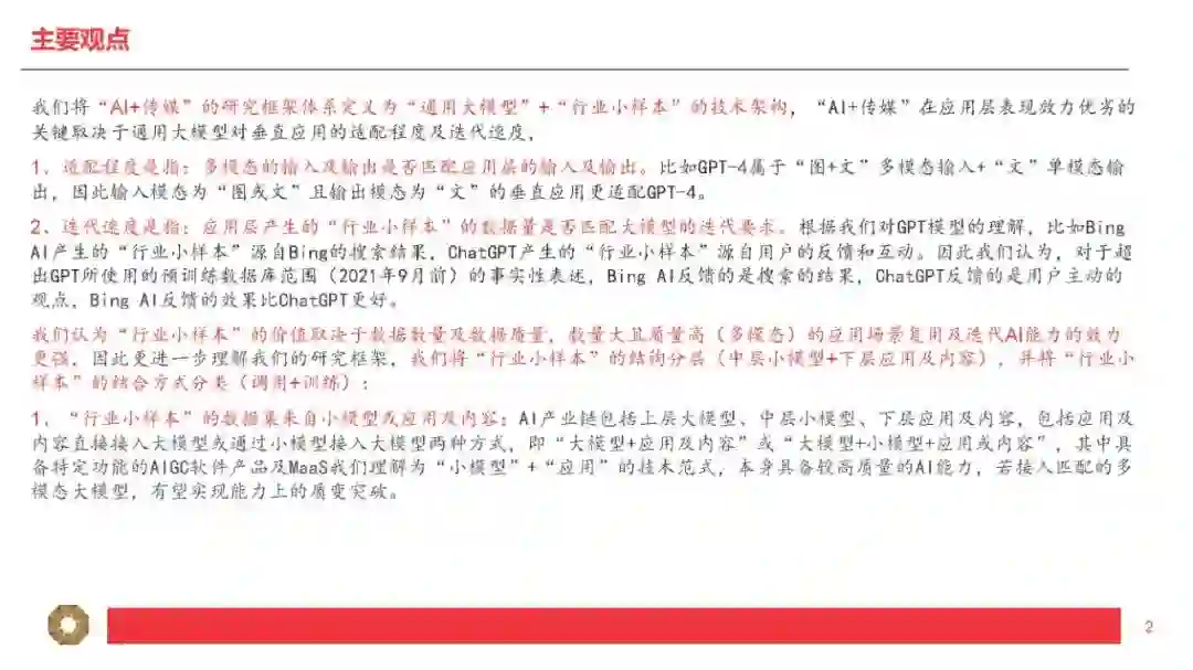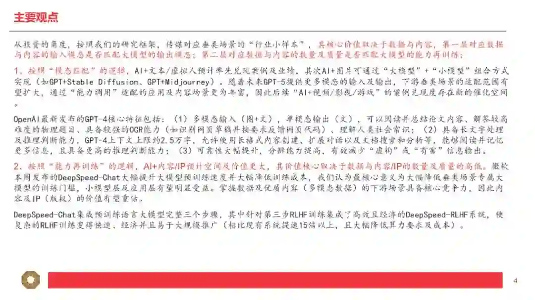 1、适配程度是指:多模态的输入及输出是否匹配应用层的输入及输出。比如GPT-4属于“图+文”多模态输入+“文”单模态输出,因此输入模态为“图或文”且输出模态为“文”的垂直应用更适配GPT-4。 2、迭代速度是指:应用层产生的“行业小样本”的数据量是否匹配大模型的迭代要求。根据我们对GPT模型的理解,比如BingAI产生的“行业小样本”源自Bing的搜索结果,ChatGPT产生的“行业小样本”源自用户的反馈和互动。因此我们认为,对于超出GPT所使用的预训练数据库范围(2021年9月前)的事实性表述,BingAI反馈的是搜索的结果,ChatGPT反馈的是用户主动的观点,BingAI反馈的效果比ChatGPT更好。 我们认为“行业小样本”的价值取决于数据数量及数据质量,数量大且质量高(多模态)的应用场景复用及迭代AI能力的效力更强,因此更进一步理解我们的研究框架,我们将“行业小样本”的结构分层(中层小模型+下层应用及内容),并将“行业小样本”的结合方式分类(调用+训练): 1、“行业小样本”的数据集来自小模型或应用及内容:AI产业链包括上层大模型、中层小模型、下层应用及内容,包括应用及内容直接接入大模型或通过小模型接入大模型两种方式,即“大模型+应用及内容”或“大模型+小模型+应用或内容”,其中具备特定功能的AIGC软件产品及MaaS我们理解为“小模型”+“应用”的技术范式,本身具备较高质量的AI能力,若接入匹配的多模态大模型,有望实现能力上的质变突破。 2、“行业小样本”的结合方式包括“能力调用”及“能力训练”两类: (1)“能力调用”是指下游垂类场景直接调用通用大模型的通用能力,并基于垂类场景内产生的特性化数据不断提升调用能力在垂类场景内的适配程度。我们认为现阶段下游应用及内容主要采取此类方式接入大模型能力,此类方式可高效快速调用大模型先进能力,在时间上及成本上具备优势。我们认为“能力调用”匹配“AI+传媒”的第一层利好,即通过AI降本增效,大幅提高数据及内容的供给量。内容产业本质由供给决定需求,因此内容供给量的明显提升将有效带动传媒基本面拐点及增量空间出现。 (2)“能力训练”是指下游垂类场景将通用大模型针对特性化数据集进行再训练,从而形成垂类场景专属大模型。例如彭博社利用自身丰富的金融数据源,基于开源的GPT-3框架再训练,开发出了金融专属大模型BloombergGPT。我们认为“能力训练”匹配“AI+传媒”的第二层利好,即下游垂类场景本身的数据或内容反过来“再训练”通用大模型(或开源大模型),形成传媒内容场景专属大模型,形成更稳定且高质的内容输出。我们认为训练难度文本<图片<视频<影视<游戏,且内容数量逐步递减但内容质量逐步递增,即偏后端的影视、游戏在内容数量上训练量级不足,因此高质量的内容形态首先通过“能力调用”输出AIGC内容,再将AIGC内容“再训练”大模型以解决高质量内容数量不足的问题(合成数据“再训练”范畴)。从投资的角度,按照我们的研究框架,传媒对应垂类场景的“行业小样本”,其核心价值取决于数据与内容,第一层对应数据与内容的输入模态是否匹配大模型的输出模态;第二层对应数据与内容的数量及质量是否匹配大模型的能力再训练: 1、按照“模态匹配”的逻辑,AI+文本/虚拟人预计率先兑现案例及业绩,其次AI+图片可通过“大模型”+“小模型”组合方式实现(如GPT+StableDiffusion、GPT+Midjourney)。随着未来GPT-5提供更多模态的输入及输出,下游垂类场景的适配范围有望扩大,通过“能力调用”适配的应用及内容场景更为丰富,因此后续“AI+视频/影视/游戏”的案例兑现度存在新的催化空间。 OpenAI最新发布的GPT-4核心特征包括:(1)多模态输入(图+文),单模态输出(文),可以阅读并总结论文内容、解答较高难度的物理题目、具备较强的OCR能力(如识别网页草稿并按要求反馈网页代码)、理解人类社会常识;(2)具备长文字处理及推理判断能力,GPT-4上下文上限约2.5万字,允许使用长格式内容创建、扩展对话以及文档搜索和分析等,能够阅读并记忆更多信息,且具备更高的推理判断能力;(3)可靠性大幅提升,分辨能力提高,有效减少“虚构”或“有害”信息输出。2、按照“能力再训练”的逻辑,AI+内容/IP预计空间及价值更大,其价值核心取决于数据与内容/IP的数量及质量的高低。微软本周发布的DeepSpeed-Chat大幅提升大模型预训练速度并大幅降低训练成本,我们认为最核心意义为大幅降低垂类场景专属大模型的训练门槛,小模型层及应用层有望明显受益。掌握数据及优质内容(多模态数据)的下游场景具备核心竞争力,因此内容及IP(版权)的价值有望重估。 DeepSpeed-Chat集成预训练语言大模型完整三个步骤,其中针对第三步RLHF训练集成了高效且经济的DeepSpeed-RLHF系统,使复杂的RLHF训练变得快速、经济并且易于大规模推广(相比现有系统提速15倍以上,且大幅降低算力要求及成本)。本文将选取国外AI图像生成领域的龙头之一进行解析,Midjourney是国外一款搭载在Discord社区上的图像生成应用,通过差异化产品定位拥有了早期数据积累及活跃社区,截至2023年3月在Discord上的用户数超1300万,是目前用户数最多的服务器,年营收约1亿美元。公司团队成员仅11人,人效极高,团队成员及顾问拥有AI技术及产品创业的复合背景,从不同纬度赋能公司发展。 基于CLIP及Diffusion的开源模型