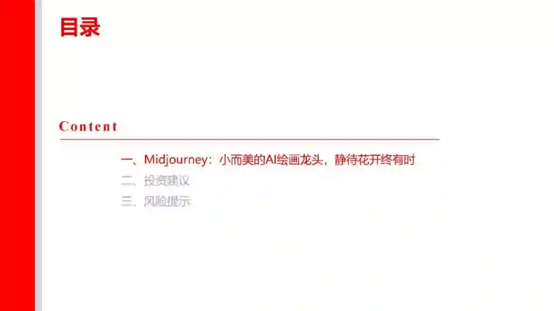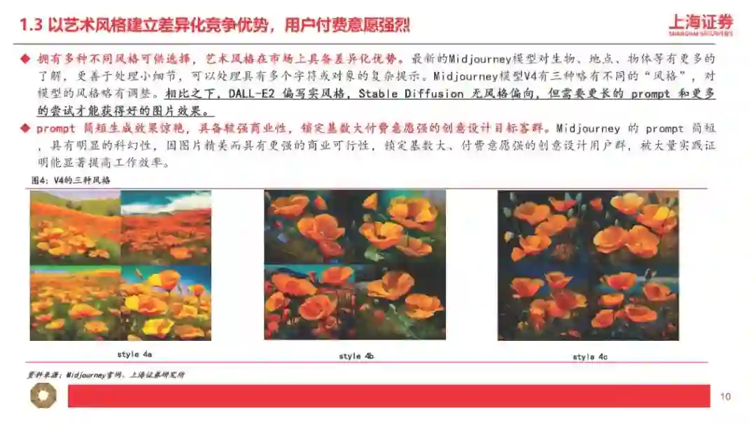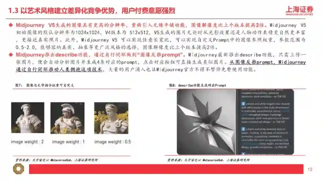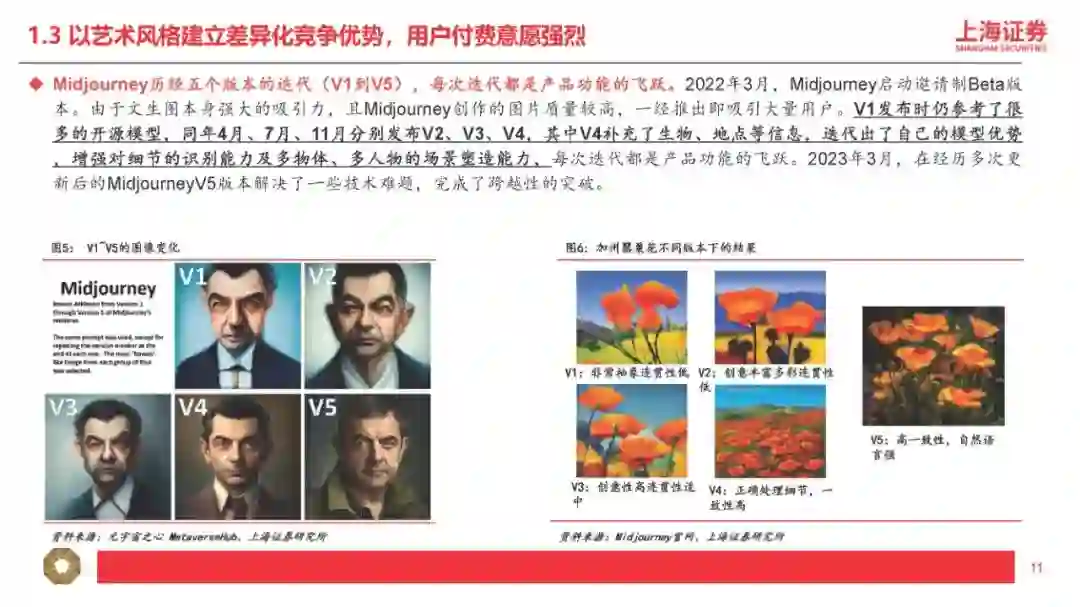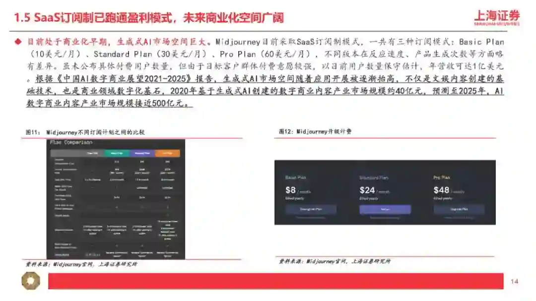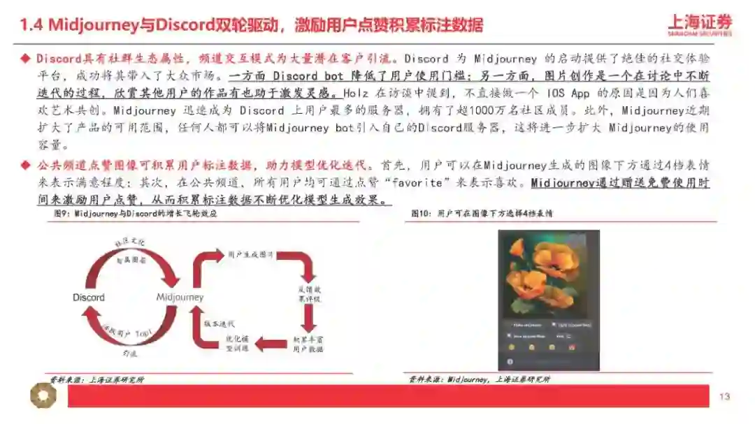 1、适配程度是指:多模态的输入及输出是否匹配应用层的输入及输出。比如GPT-4属于“图+文”多模态输入+“文”单模态输出,因此输入模态为“图或文”且输出模态为“文”的垂直应用更适配GPT-4。 2、迭代速度是指:应用层产生的“行业小样本”的数据量是否匹配大模型的迭代要求。根据我们对GPT模型的理解,比如BingAI产生的“行业小样本”源自Bing的搜索结果,ChatGPT产生的“行业小样本”源自用户的反馈和互动。因此我们认为,对于超出GPT所使用的预训练数据库范围(2021年9月前)的事实性表述,BingAI反馈的是搜索的结果,ChatGPT反馈的是用户主动的观点,BingAI反馈的效果比ChatGPT更好。 我们认为“行业小样本”的价值取决于数据数量及数据质量,数量大且质量高(多模态)的应用场景复用及迭代AI能力的效力更强,因此更进一步理解我们的研究框架,我们将“行业小样本”的结构分层(中层小模型+下层应用及内容),并将“行业小样本”的结合方式分类(调用+训练): 1、“行业小样本”的数据集来自小模型或应用及内容:AI产业链包括上层大模型、中层小模型、下层应用及内容,包括应用及内容直接接入大模型或通过小模型接入大模型两种方式,即“大模型+应用及内容”或“大模型+小模型+应用或内容”,其中具备特定功能的AIGC软件产品及MaaS我们理解为“小模型”+“应用”的技术范式,本身具备较高质量的AI能力,若接入匹配的多模态大模型,有望实现能力上的质变突破。 2、“行业小样本”的结合方式包括“能力调用”及“能力训练”两类: (1)“能力调用”是指下游垂类场景直接调用通用大模型的通用能力,并基于垂类场景内产生的特性化数据不断提升调用能力在垂类场景内的适配程度。我们认为现阶段下游应用及内容主要采取此类方式接入大模型能力,此类方式可高效快速调用大模型先进能力,在时间上及成本上具备优势。我们认为“能力调用”匹配“AI+传媒”的第一层利好,即通过AI降本增效,大幅提高数据及内容的供给量。内容产业本质由供给决定需求,因此内容供给量的明显提升将有效带动传媒基本面拐点及增量空间出现。 (2)“能力训练”是指下游垂类场景将通用大模型针对特性化数据集进行再训练,从而形成垂类场景专属大模型。例如彭博社利用自身丰富的金融数据源,基于开源的GPT-3框架再训练,开发出了金融专属大模型BloombergGPT。我们认为“能力训练”匹配“AI+传媒”的第二层利好,即下游垂类场景本身的数据或内容反过来“再训练”通用大模型(或开源大模型),形成传媒内容场景专属大模型,形成更稳定且高质的内容输出。我们认为训练难度文本<图片<视频<影视<游戏,且内容数量逐步递减但内容质量逐步递增,即偏后端的影视、游戏在内容数量上训练量级不足,因此高质量的内容形态首先通过“能力调用”输出AIGC内容,再将AIGC内容“再训练”大模型以解决高质量内容数量不足的问题(合成数据“再训练”范畴)。从投资的角度,按照我们的研究框架,传媒对应垂类场景的“行业小样本”,其核心价值取决于数据与内容,第一层对应数据与内容的输入模态是否匹配大模型的输出模态;第二层对应数据与内容的数量及质量是否匹配大模型的能力再训练: 1、按照“模态匹配”的逻辑,AI+文本/虚拟人预计率先兑现案例及业绩,其次AI+图片可通过“大模型”+“小模型”组合方式实现(如GPT+StableDiffusion、GPT+Midjourney)。随着未来GPT-5提供更多模态的输入及输出,下游垂类场景的适配范围有望扩大,通过“能力调用”适配的应用及内容场景更为丰富,因此后续“AI+视频/影视/游戏”的案例兑现度存在新的催化空间。 OpenAI最新发布的GPT-4核心特征包括:(1)多模态输入(图+文),单模态输出(文),可以阅读并总结论文内容、解答较高难度的物理题目、具备较强的OCR能力(如识别网页草稿并按要求反馈网页代码)、理解人类社会常识;(2)具备长文字处理及推理判断能力,GPT-4上下文上限约2.5万字,允许使用长格式内容创建、扩展对话以及文档搜索和分析等,能够阅读并记忆更多信息,且具备更高的推理判断能力;(3)可靠性大幅提升,分辨能力提高,有效减少“虚构”或“有害”信息输出。2、按照“能力再训练”的逻辑,AI+内容/IP预计空间及价值更大,其价值核心取决于数据与内容/IP的数量及质量的高低。微软本周发布的DeepSpeed-Chat大幅提升大模型预训练速度并大幅降低训练成本,我们认为最核心意义为大幅降低垂类场景专属大模型的训练门槛,小模型层及应用层有望明显受益。掌握数据及优质内容(多模态数据)的下游场景具备核心竞争力,因此内容及IP(版权)的价值有望重估。 DeepSpeed-Chat集成预训练语言大模型完整三个步骤,其中针对第三步RLHF训练集成了高效且经济的DeepSpeed-RLHF系统,使复杂的RLHF训练变得快速、经济并且易于大规模推广(相比现有系统提速15倍以上,且大幅降低算力要求及成本)。本文将选取国外AI图像生成领域的龙头之一进行解析,Midjourney是国外一款搭载在Discord社区上的图像生成应用,通过差异化产品定位拥有了早期数据积累及活跃社区,截至2023年3月在Discord上的用户数超1300万,是目前用户数最多的服务器,年营收约1亿美元。公司团队成员仅11人,人效极高,团队成员及顾问拥有AI技术及产品创业的复合背景,从不同纬度赋能公司发展。 基于CLIP及Diffusion的开源模型