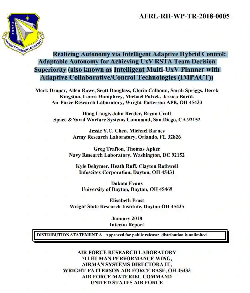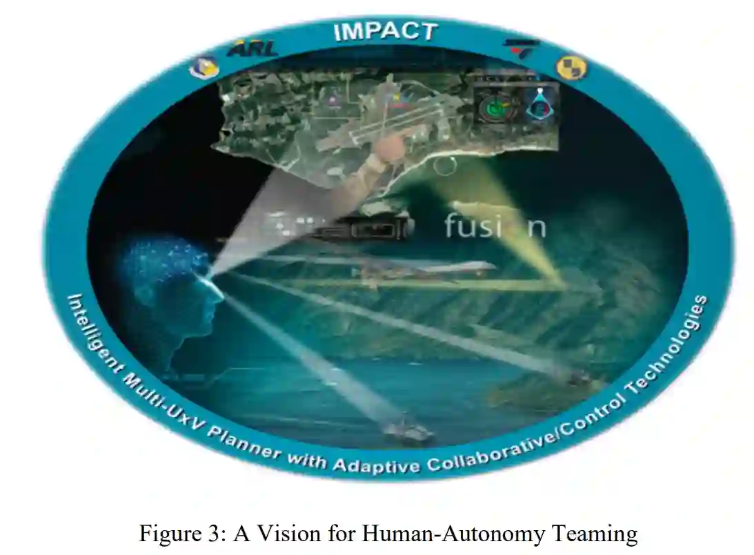 战术决策和任务管理的敏捷性是异构无人系统(UxV)团队成功驾驭 “战争迷雾 ”的关键属性,而 “战争迷雾 ”本身就具有复杂性、模糊性和时间挑战性。这种敏捷性要求操作员与自动驾驶员之间有效的团队合作,包括实现可信赖的协作,以及团队任务分担和决策优势所需的灵活、高级别的任务分配。一个三军团队开展了由美国国防部研究与工程助理部长(ASD/R&E)赞助的研究,重点研究 “采用自适应协作/控制技术的智能多 UxV 规划系统”(IMPACT)的实例化,该系统结合了灵活的任务分配要求、双向人机交互、先进的合作控制算法、智能体推理和自主技术,使单个操作员能够有效指挥和控制(C2)多 UxV 合作任务(图 1)。在智能辅助下,IMPACT 操作员能够对总共 12 辆 UxV(4 辆空中、4 辆地面和 4 辆海面无人系统)进行任务分配和管理,以应对在模拟进行中的基地周边防御任务中出现的若干突发事件。本执行摘要简要介绍了 IMPACT 系统的主要特点,而本报告的其余部分则详细描述了与本项目相关的所有研究内容。