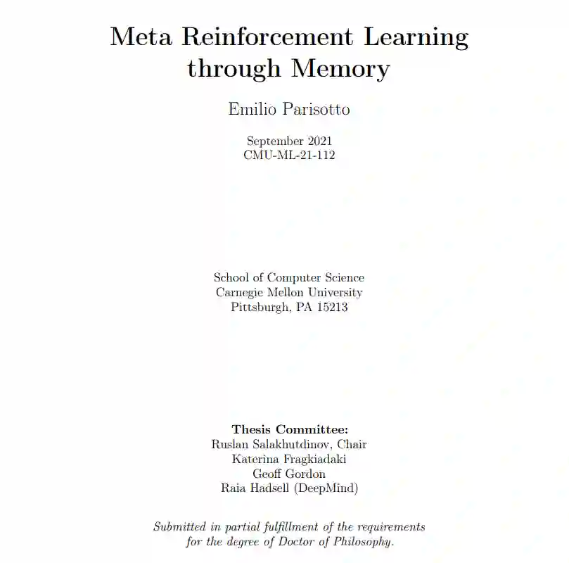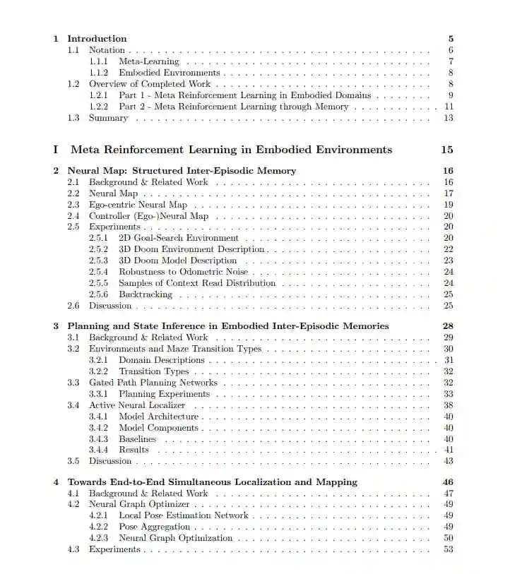 论文的第一部分集中在“具身”类环境,其中一个主体在一个类似自然世界的环境中有物理表现。我们利用这种高度结构化的环境集来设计具有快速记忆、规划和状态推断能力的整体嵌入式代理体系结构。在论文的第二部分,我们将重点放在没有强公共子结构的一般环境中应用的方法。首先,我们重新检查元学习代理与环境的交互模式:提出用一个并行执行框架来取代典型的顺序处理交互历史,其中多个智能体并行地在环境中行动。接下来,我们讨论了一个通用的和强大的序列模型的使用片段间存储器,门控transformer,展示了性能和数据效率的巨大改进。最后,我们开发了一种方法,可以显著降低(元)强化学习设置中transformer模型的训练成本和作用延迟,目的是(1)使它们在研究社区中更广泛地使用,(2)解锁它们在实时和延迟受限的应用中使用,如机器人。