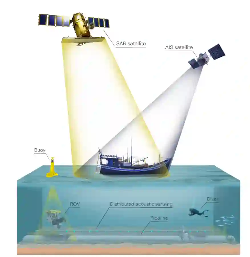 图2. 监测水下关键基础设施(UCIs)的概念性图示。根据UCI的位置和天气条件,水面上的破坏活动可能由专门的潜水员在水面船只的支持下进行;在某些情况下也可能采用遥控潜水器(ROV)。水上系统和传感器,如自动识别系统(AIS)和合成孔径雷达(SAR),可以提供大规模监测能力。这些可由水下资产补充,如分布式声学传感(DAS),以确保全面的海上监视。