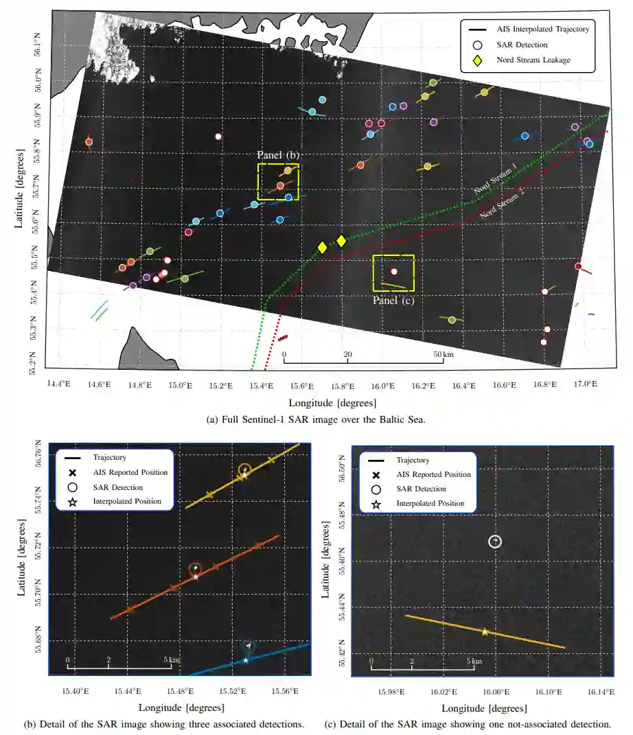 图4. 北溪案例。爆炸前几天在波罗的海上空获得的Sentinel-1 SAR图像。彩色实线是通过插值船舶本身提供的AIS位置获得的船舶轨迹。圆圈是在SAR图像中检测到的船只:圆圈的颜色表明检测来自AIS轨迹具有相同颜色的船只;白圈表示检测与任何AIS轨迹无关。面板(b)和(c)显示了完整SAR图像的两个细节,分别显示了相关检测和不相关检测的例子。这里,交叉点描述了AIS报告的位置,星星是图像采集时船只的插值位置。