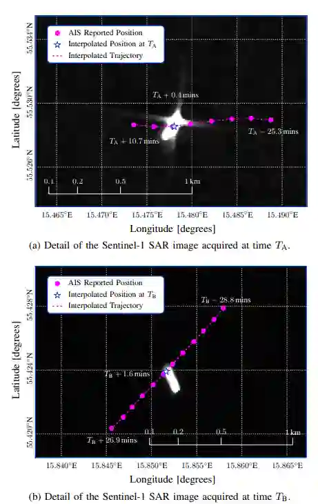 图4a中AIS轨迹和SAR探测之间的关联是通过解决一个特定的分配问题来实现的(显然,在MTT文献中还有其他的解决方案,在上一节中讨论过)。任何SAR检测-AIS轨迹对之间的分配成本是SAR检测的位置和图像采集时船舶的内插位置之间的相对距离,如果这个距离低于3公里,否则就假定是无限的。然后用与AIS轨迹颜色相匹配的圆圈来表示关联;白色圆圈代表没有与任何AIS轨迹关联的SAR检测。我们观察到,图4a中检测到的大多数船只都与AIS轨迹有关。图4b和4c分别展示了相关检测和不相关检测的两个例子。第一幅图显示了三艘被检测到的船只,每艘都在一个彩色的圆圈内。圆圈的颜色与AIS轨迹的颜色相吻合,AIS报告的位置由交叉点代表,通过内插得到。星形表示图像采集时船舶的内插位置;合成孔径雷达检测到的船舶形状与其内插的AIS位置之间的偏移是由于船舶本身运动产生的未知多普勒频率,因此它与船舶的速度有关[79]。相反,图4c显示了一艘被探测到的船只--围在白圈内--与任何AIS轨迹无关;实际上,最近的AIS内插位置在3公里以上。然而,这条AIS轨迹呈现出一个相关的特征,即在采集SAR图像前后,AIS数据有几个小时的间隔(但不到6小时)。一方面,这可能表明检测到的物体和图4c中描述的AIS轨迹确实指的是同一艘船;另一方面,AIS数据中的空白和检测到的船舶位置偏离了线性路径,可能是一种异常行为的迹象。