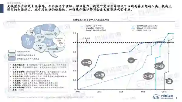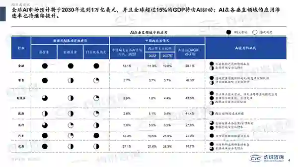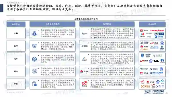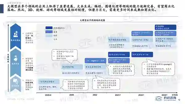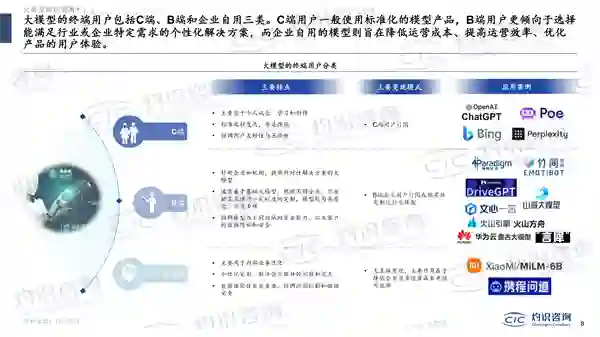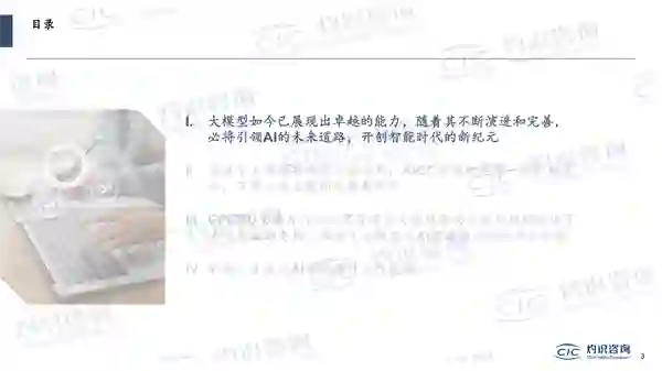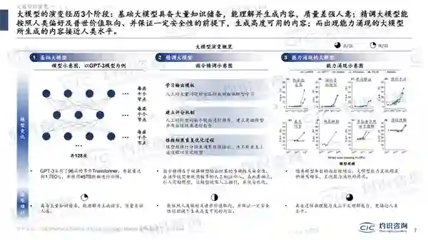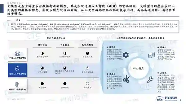 来源:CIC灼识咨询 随着全球算力的不断升级,人工智能行业进入了飞速发展状态,推动各行各业向智能时代迈进。而大模型作为当前人工智能行业的焦点,有望将人类对于整个世界的认知压缩在一个模型中,让我们看到了实现通用人工智能的路径。 大模型也改变并引领了AIGC的时代,让AI能够像人类一样创造各种类型的高质量内容,包括文本、图像、音频、视频等。从创意产业到新闻媒体和数字营销,AIGC正在重新定义着内容创作和分发的方式。 一、什么是大模型 大模型是基于海量多源数据打造的模型,其是实现通用人工智能(AGI)的重要路径。大模型可以整合多种不同类型的数据和信息,实现多模态处理和分析,从而更全面地理解和解决复杂问题,其具备通用性、涌现性等诸多特点。 大模型产业涵盖了行业应用、产品服务、模型工具和基础设施四个关键层面,广泛应用于各行业与垂直场景,前景广阔。 二、AIGC有望掀起新一轮产业革命 AIGC是继PGC和UGC之后,经由AI自动生成内容的新型内容生产方式。作为一种先进的生产力变革,AIGC的兴起让世界进入了智能创作时代。 对于企业而言,AIGC在降低内容制作成本、加快内容制作效率的同时提升了内容的多样性及质量,AIGC与不同产业融合互动亦可孕育出新业态新模式;对个人而言,AIGC则显著降低了内容创作门槛。 目前,AIGC产业仍处于早期发展阶段,在数据、算法和算力的基础之上,核心模型以关键企业研究成果为主导,AIGC以AI生成文本、图像、视频和音频为主流形式。 三、GPGPU是未来AI发展的重要基础设施 GPU可根据其功能和集成方法进行分类。GPGPU出色的处理和并行计算能力被广泛应用于大模型、高性能计算和其他领域,也是未来AI发展的重要基础设施。 软硬件集成所带来的性能优化已成为GPGPU的关键竞争力。计算能力、热设计功耗、能效比、进程、内存和内存带宽等是GPGPU的关键参数。 全文如下: