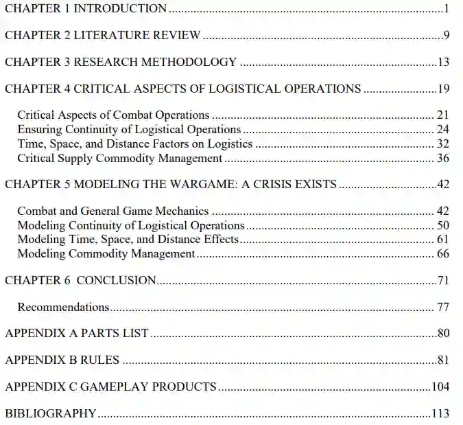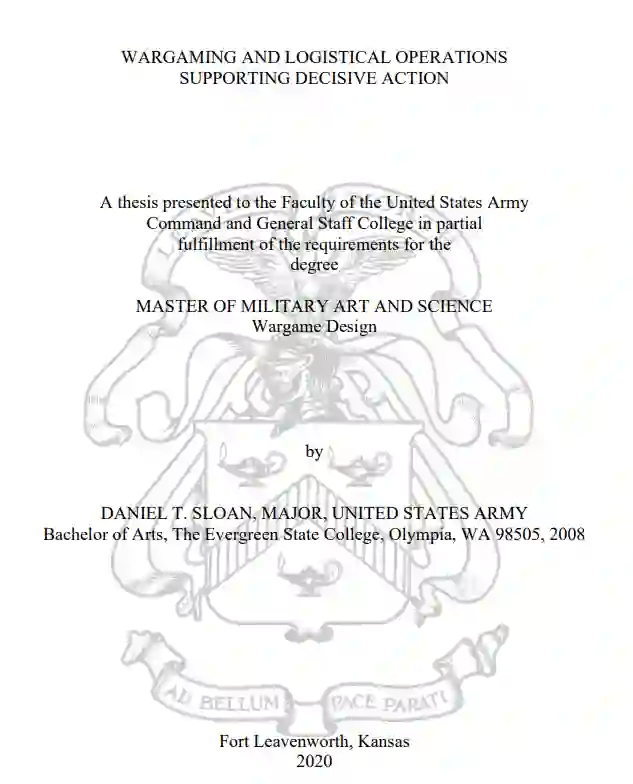 本论文研究了创建一个兵棋游戏的可行性,该游戏旨在模拟后勤人员在旅级决战中的后勤行动和决策。为论文开发的名为 “危机存在 ”的兵棋推演表明,一个模型可以合理准确地描绘强调 ADP 4-0 规定的八项维持原则的情况。“危机存在 展示了强调战场上适当后勤规划需求的能力,这能使旅战斗小组取得战术成功。“危机存在 要求玩家预测未来的后勤需求,预先计划后勤支持,并积极执行后勤计划,以实现演习最终状态。因此,“危机存在 展示了兵棋推演的设计,以激发与决战相关的后勤环境教育。