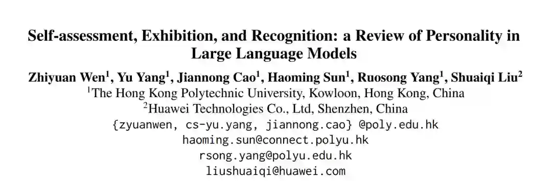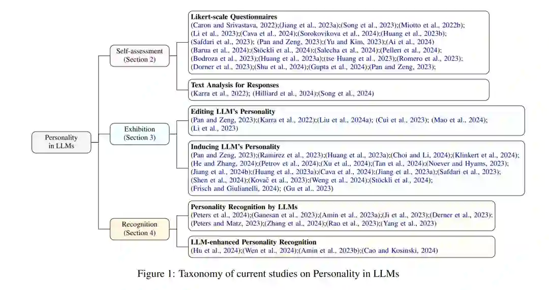 大型语言模型(LLMs)展现出了令人印象深刻的语言理解和生成能力,使其能够与用户进行连贯、类人对话。这些显著进展引发了广泛的应用(Chen et al., 2023; Zheng et al., 2023; He et al., 2023),并激发了越来越多的研究人员对LLMs中人格的探索兴趣。 人格被描述为塑造个体思想、情感和行为的持久特征(Mischel et al., 2007)。在LLMs的背景下,研究人员对LLMs是否具有内在的人格特质或LLMs在交互中处理与人格相关任务的能力感到好奇。这些研究有助于理解LLMs的心理描绘(Huang et al., 2023b),并进一步构建更加透明、安全和可信的AI系统(Safdari et al., 2023)。 鉴于此,过去两年中在这个跨学科领域涌现了大量研究,如附录A所示。然而,心理学人格研究的多样性(Hodo, 2006)和LLMs的快速发展使得不仅难以全面了解这一研究领域,还难以比较不同方法、得出一般性结论并将研究成果应用于实际应用。具体而言,当前研究在以下方面表现出混乱: